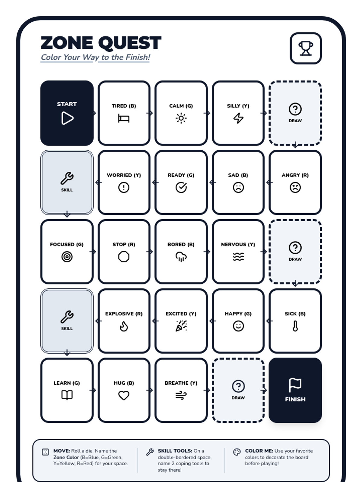 A printable board game where students navigate through various scenarios, identifying emotions and selecting appropriate coping skills to reach the finish line. Now in black and white for easy coloring and featuring 15 unique scenario cards. Now fixed for pathing and font size.