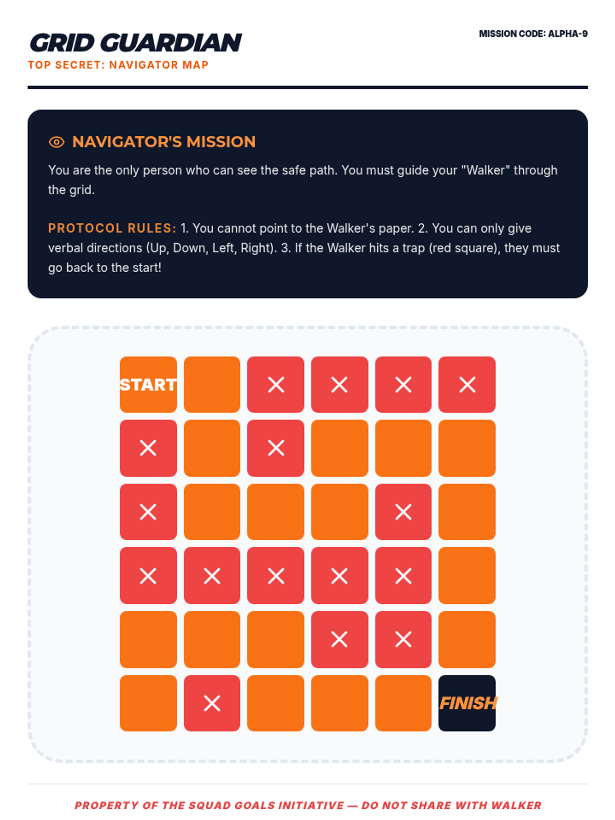 A 2-page collaborative communication activity where one student (Navigator) has a secret map and must verbally guide another student (Walker) through a grid while avoiding traps. Requiring only paper and pencils, it emphasizes clear instructions and active listening.