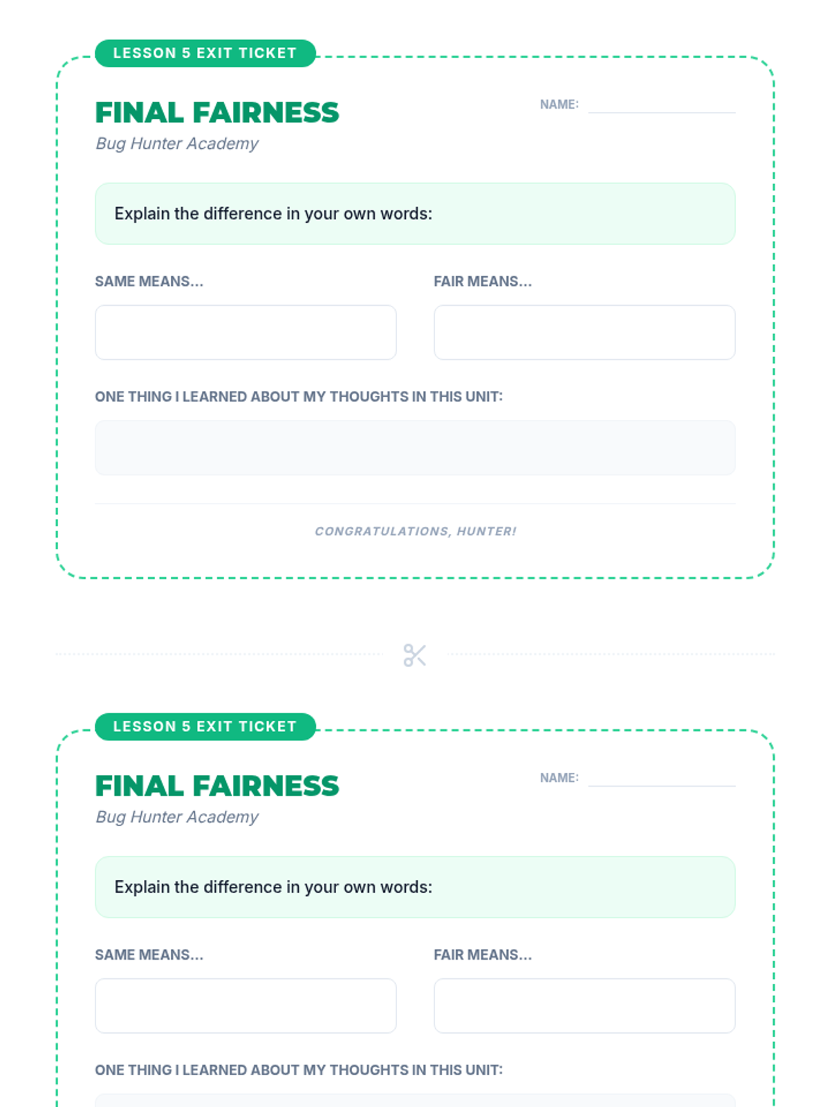 The final exit ticket for Lesson 5 focusing on Not Fair Frank's 'Fair vs. Same' concept and a general unit reflection. Provided as two per page.