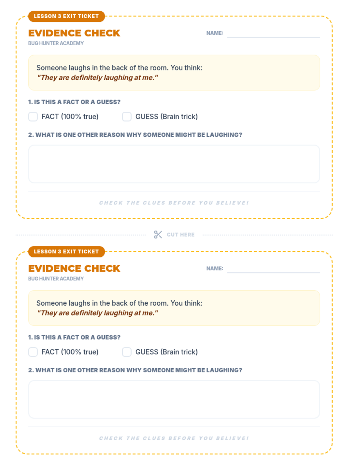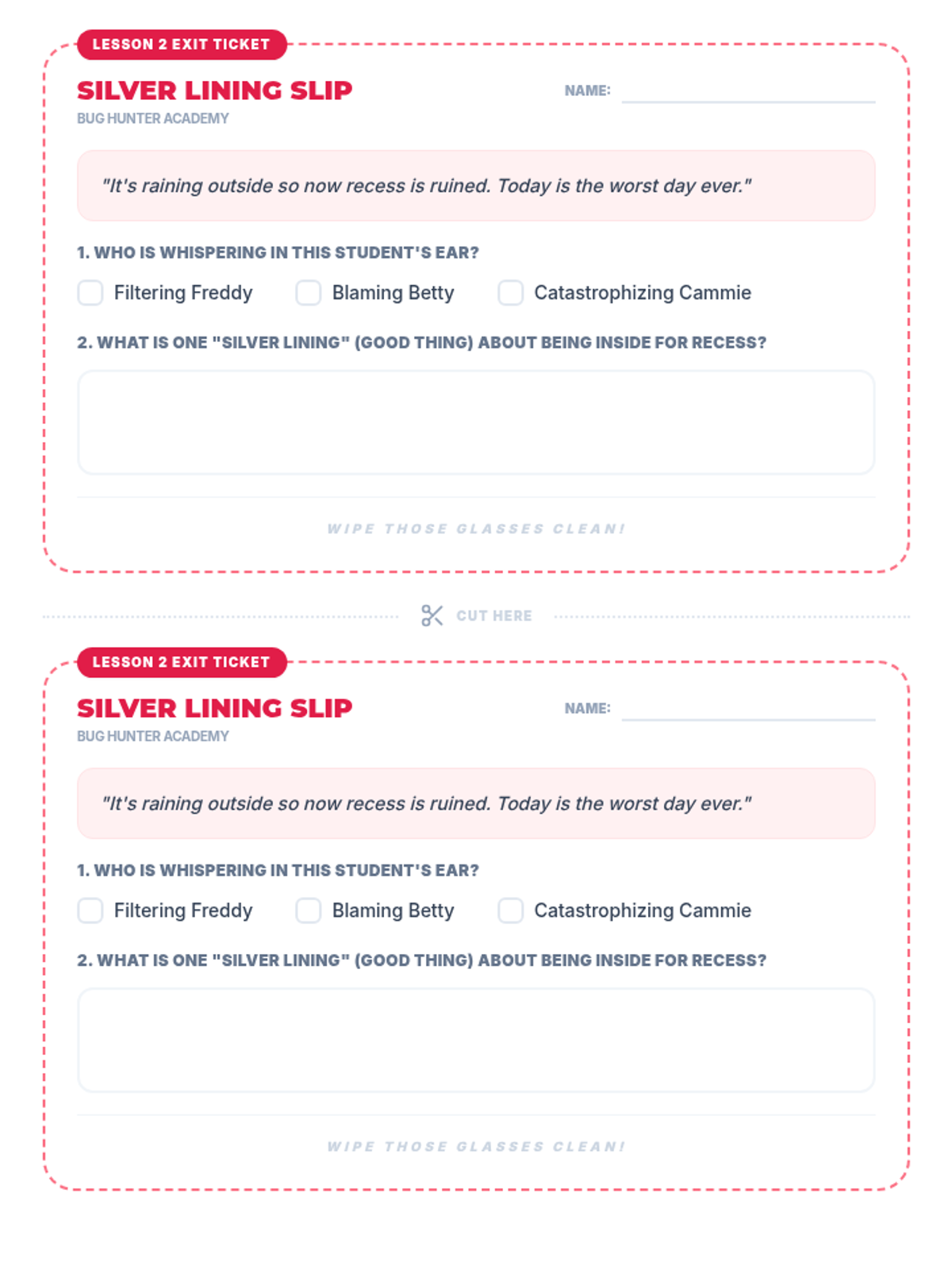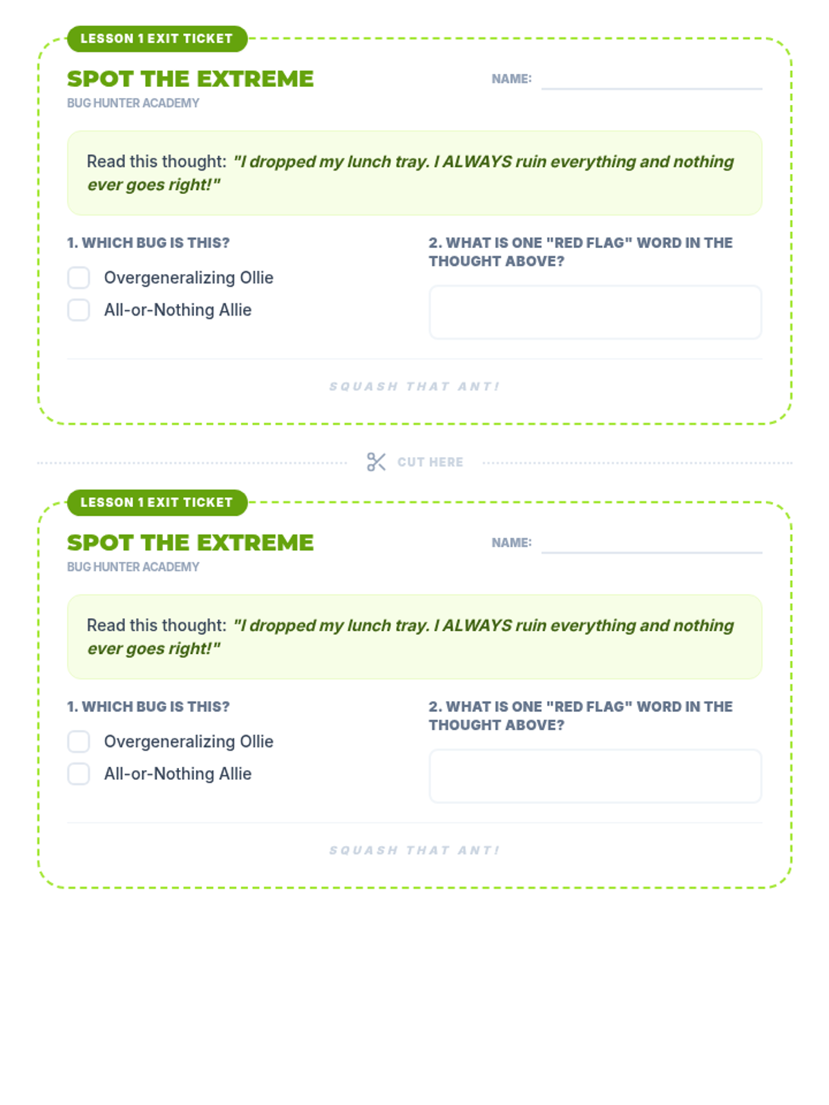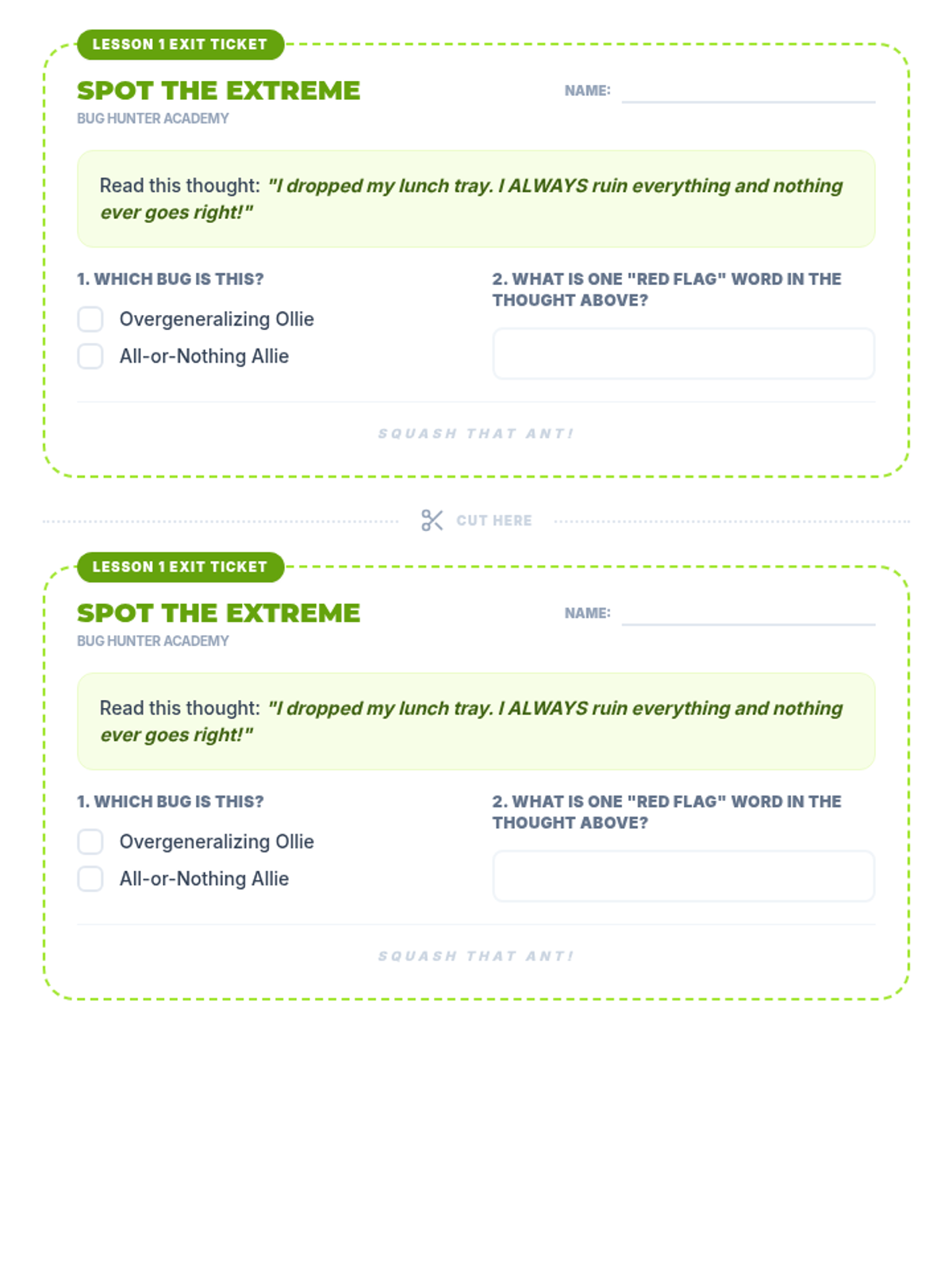 A quick exit ticket for Lesson 1 where students identify an 'Extreme Thinker' bug and its red flag words from a scenario. Designed as two per page for easy printing.