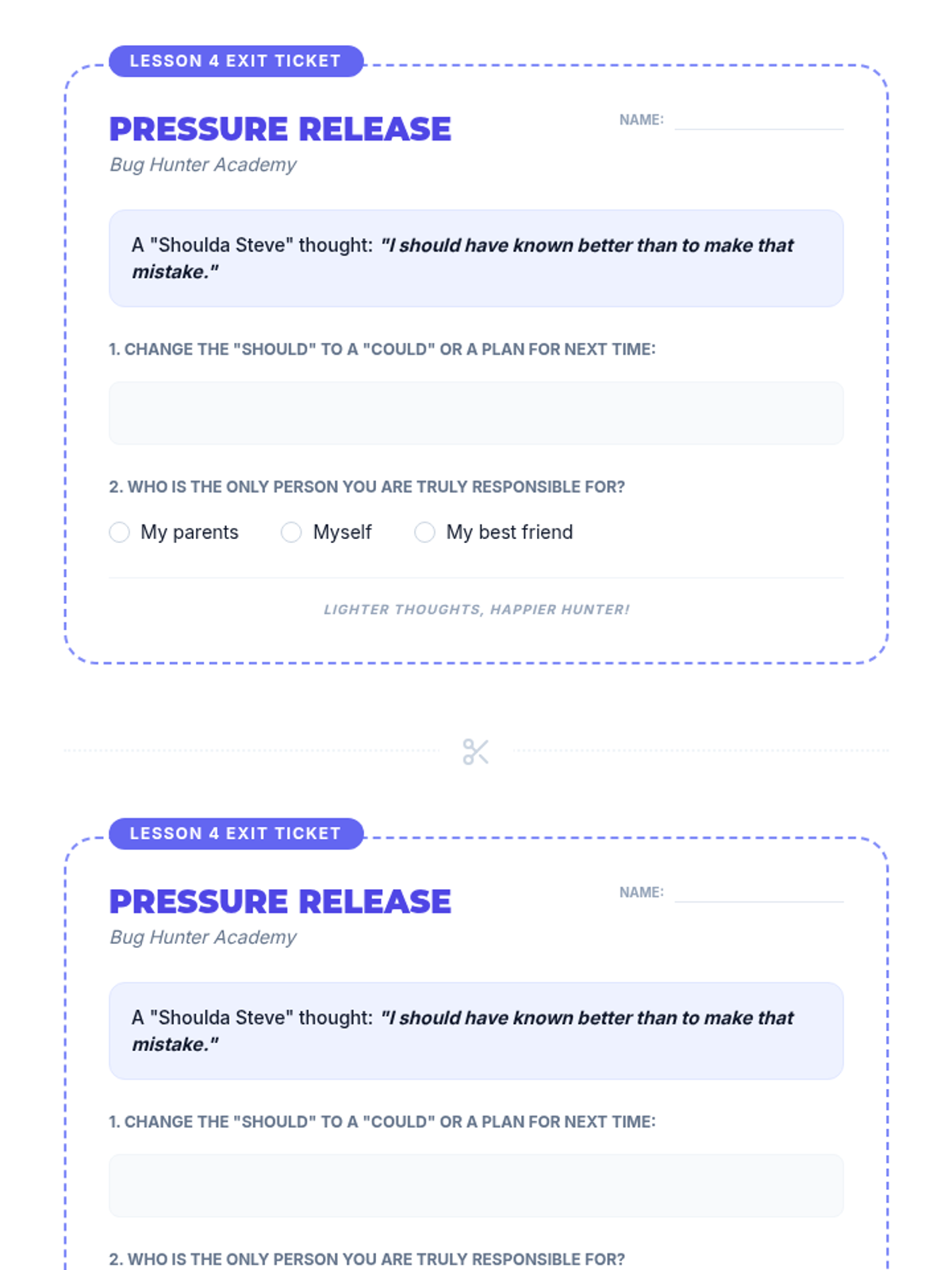 An exit ticket for Lesson 4 focusing on swapping 'should' statements and identifying the circle of control. Provided as two per page.