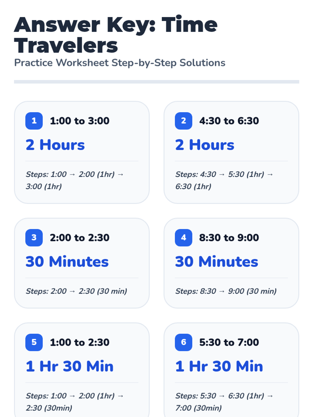 A comprehensive answer key for the Time Travelers Practice Worksheet. Revised with consistent step-by-step logic, improved text contrast, and better page layout to ensure problems stay intact across page breaks.