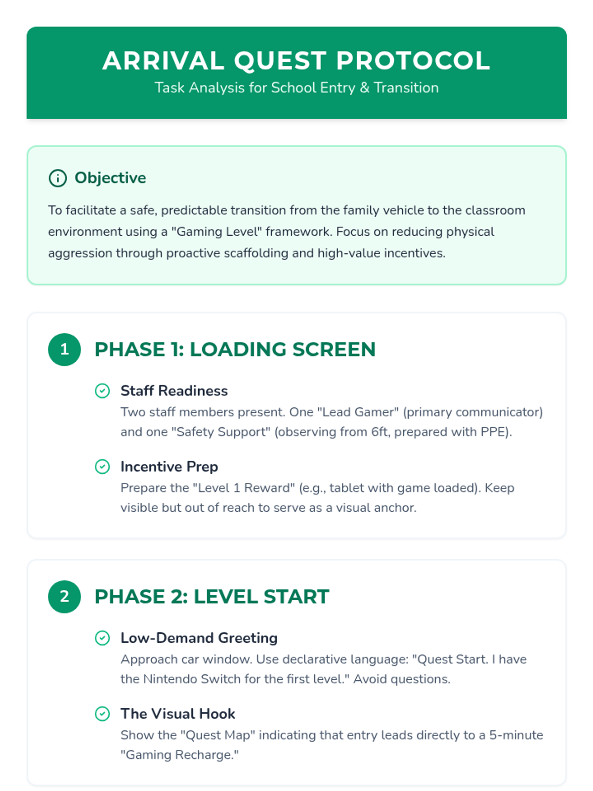 A teacher-facing task analysis protocol for school arrival and transition, using a gaming-themed framework to reduce refusal and aggression.