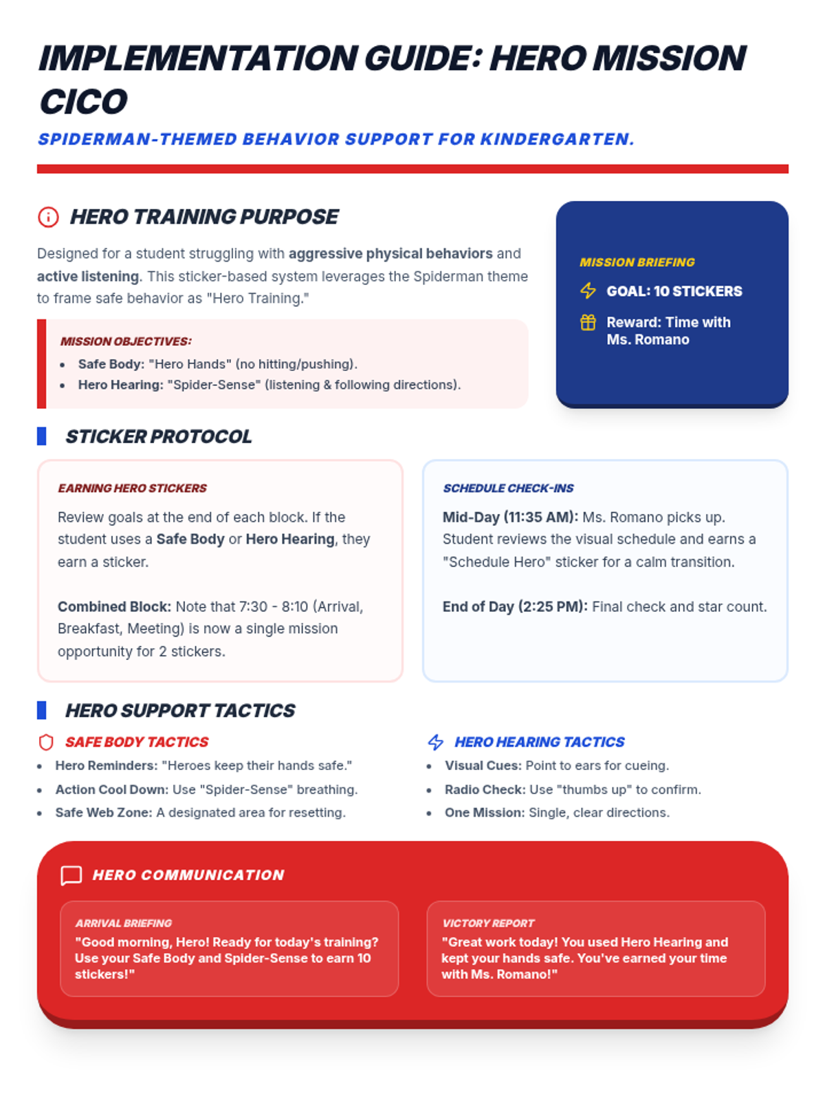 A facilitator guide for teachers implementing the Spiderman-themed Hero Mission CICO system. Includes updated schedule details (Arrival/Meeting combo), specific transition notes, and Hero-themed behavior support strategies. Optimized for a single-page layout.