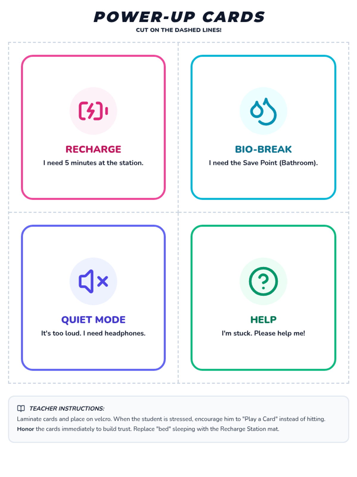 A set of communication cards themed as gaming "Power-Ups" to help the student request breaks, bathroom use, or help appropriately.