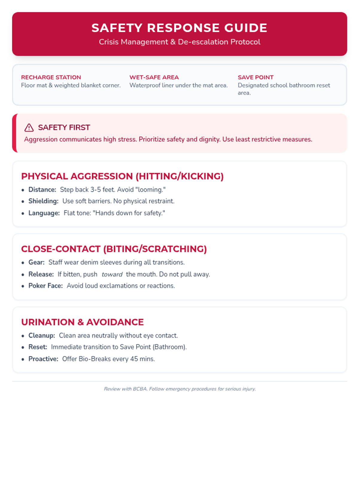 A safety protocol for teachers to manage aggressive behaviors and classroom incidents, focusing on de-escalation and protective strategies.