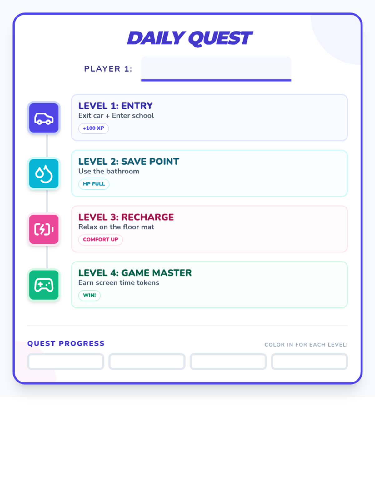 A student-facing visual schedule themed like a video game quest map to increase engagement and predictability during school arrival and the first half of the day.