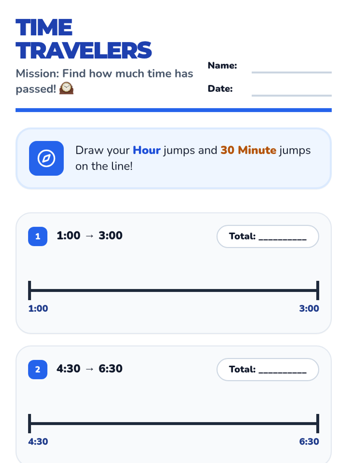A practice worksheet for elapsed time with 10 problems focusing on hours and 30-minute intervals. Features expanded drawing space and high-contrast number lines for student accessibility. Revised to prevent page breaks within problems.