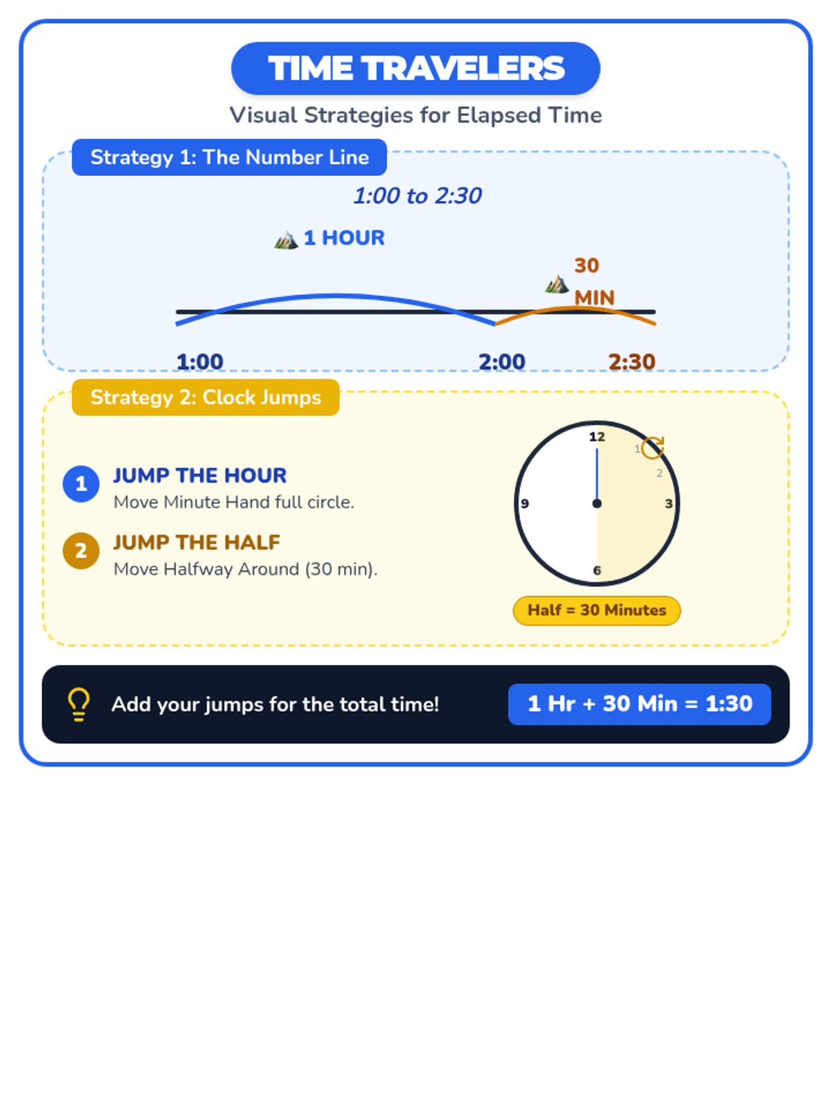 A high-contrast visual anchor chart for 3rd-grade special education students. It uses large text and clear graphics to explain number line and clock jump strategies for elapsed time. Consolidated to a single page for classroom display.