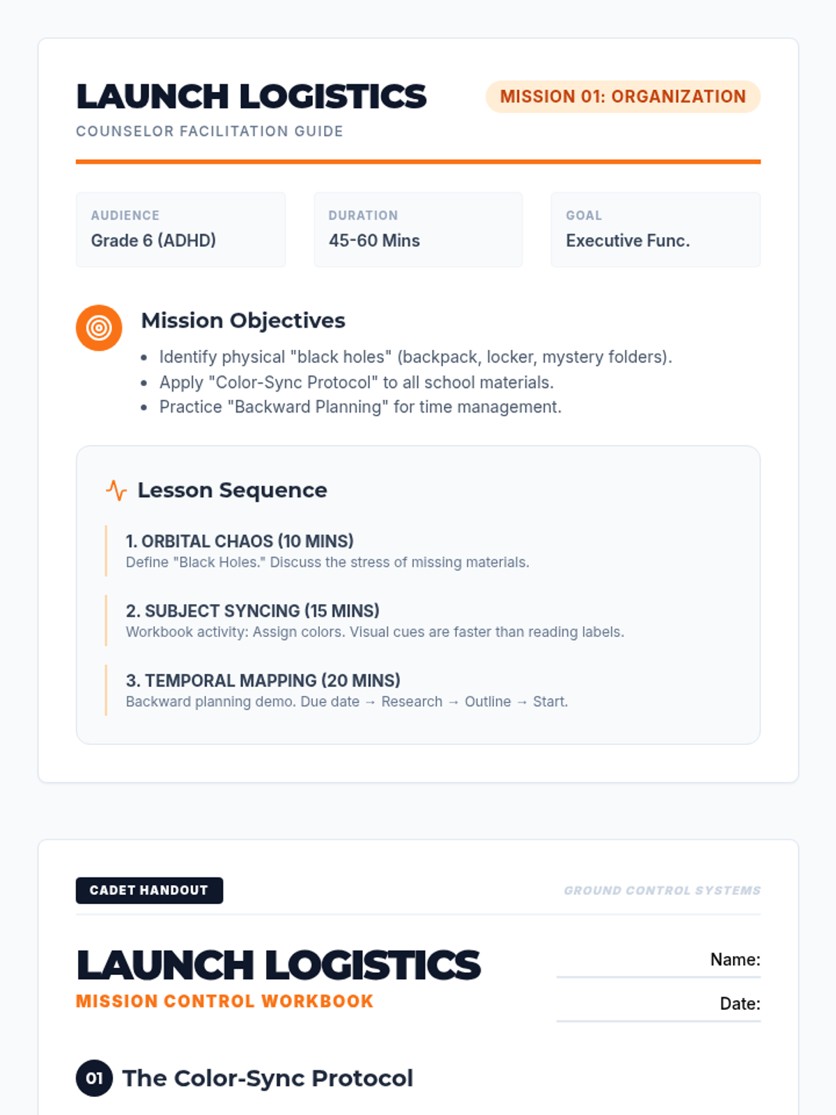 Launch Logistics Counselor Guide and Student Workbook: A revised resource featuring a clear separation between teacher and student sections, improved contrast, and better spatial layout for student writing areas.
