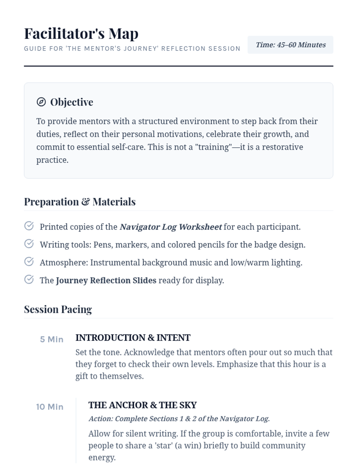 A facilitator's guide for conducting a mentor reflection workshop, including session timing, discussion prompts, and atmospheric tips.