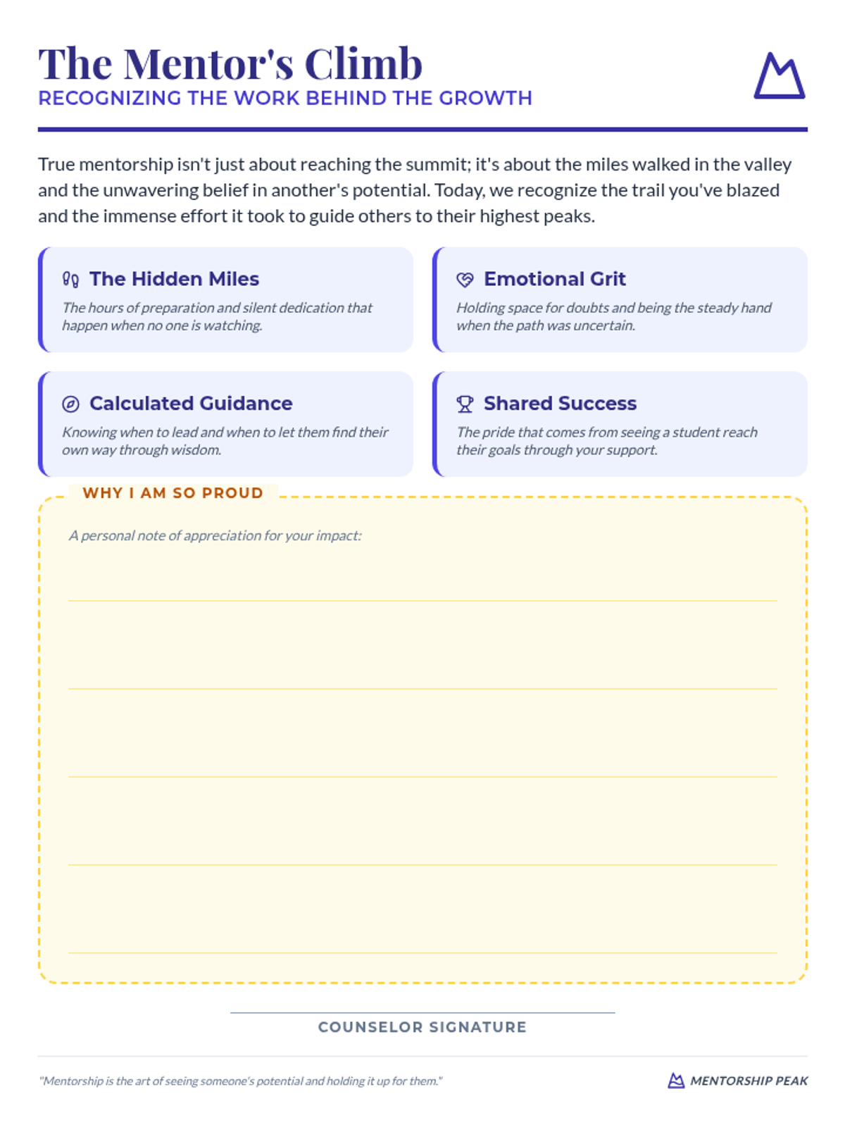A companion handout for a mentor appreciation event, outlining the "hidden work" of mentorship and providing space for a counselor or student to write a personal note of pride and gratitude. Revised for single-page layout with improved signature area.