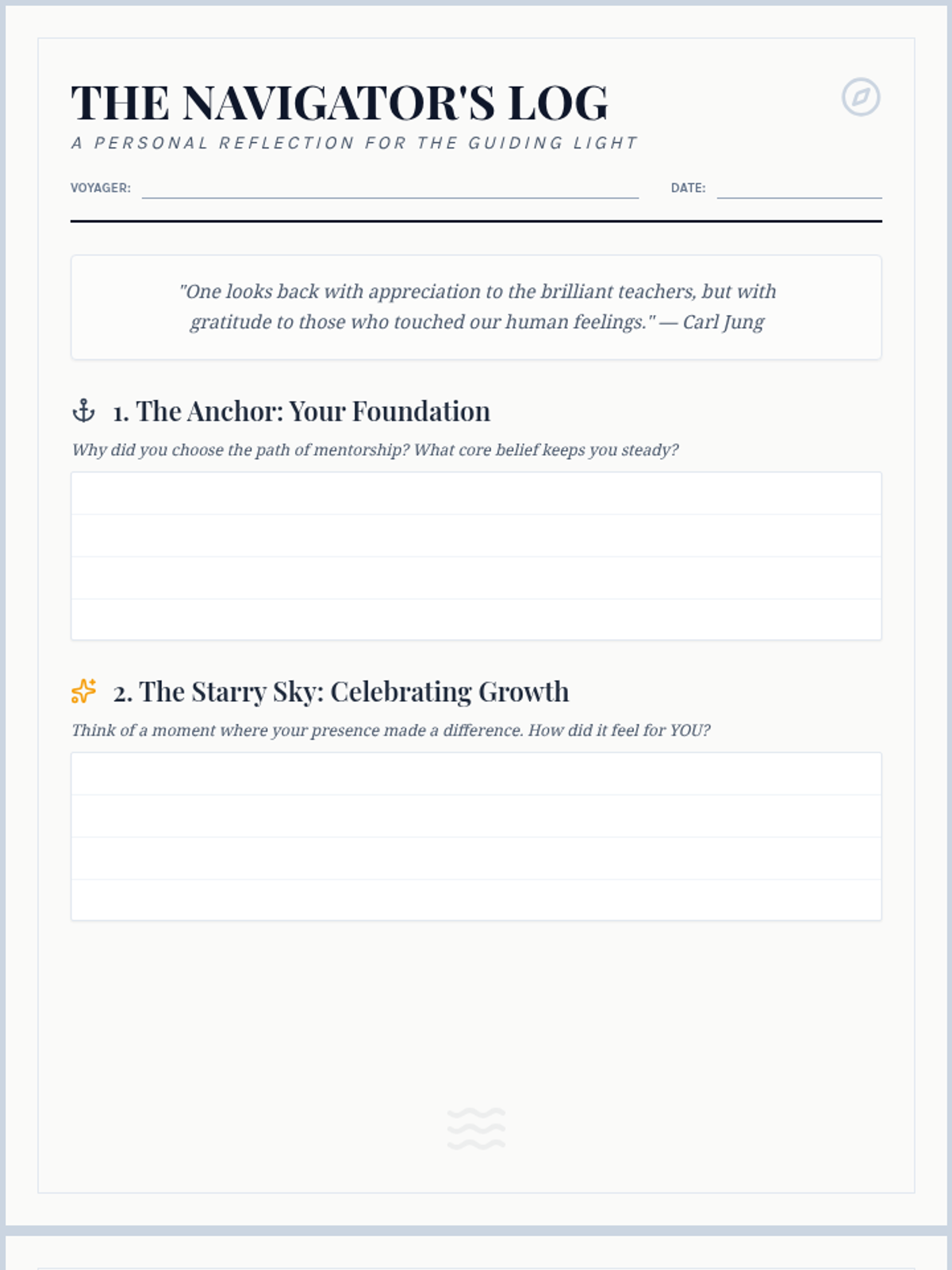A two-page (front and back) vintage explorer-themed reflection worksheet for mentors to celebrate their achievements, identify self-care needs, and set personal growth goals.