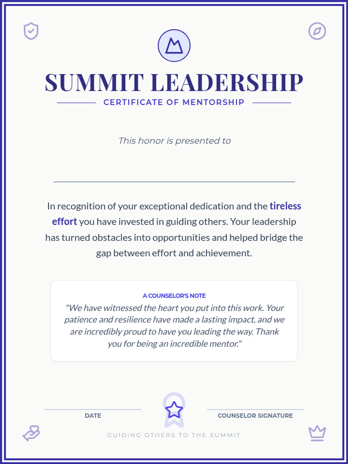 A "Summit Leadership" certificate for a mentor, celebrating their dedication and the impact of their guidance, featuring a signature space for a counselor.