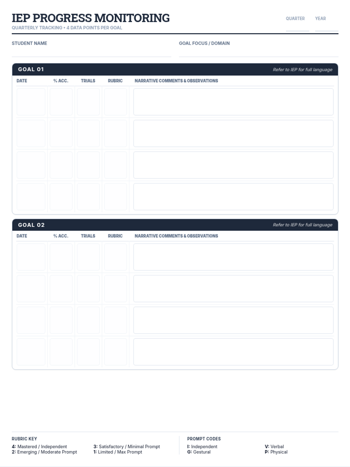 A professional, high-utility IEP quarterly progress monitoring document. It features sections for four goals, with tracking for percentages, trial counts, and a 1-4 rubric scale across four data points per quarter, including space for narrative observations.