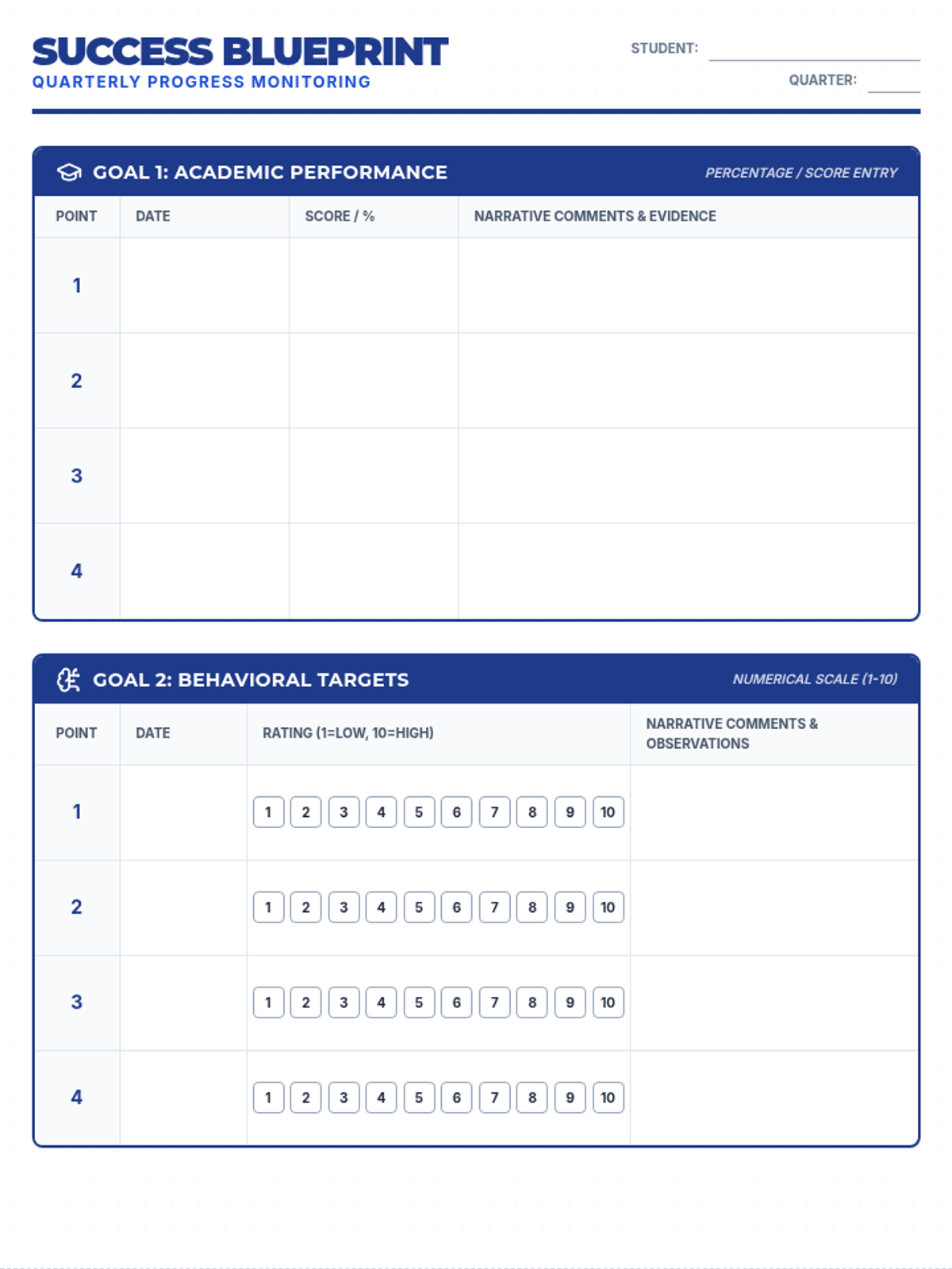 A quarterly student progress monitoring sheet featuring sections for Academic Performance, Behavioral Targets, Professional Standards, and Attendance & Participation, with specialized data collection fields for each.