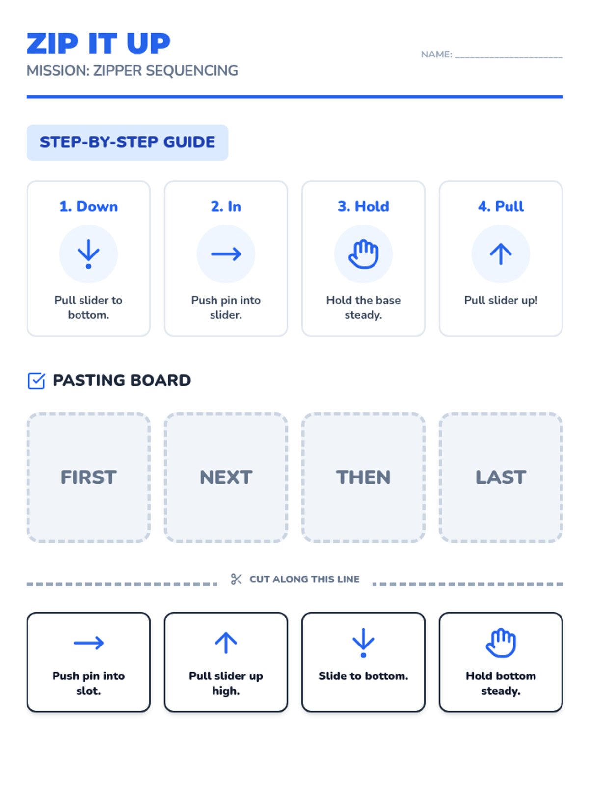 A student worksheet featuring visual step-by-step instructions and a cut-and-paste sequencing activity to reinforce the stages of zipping.