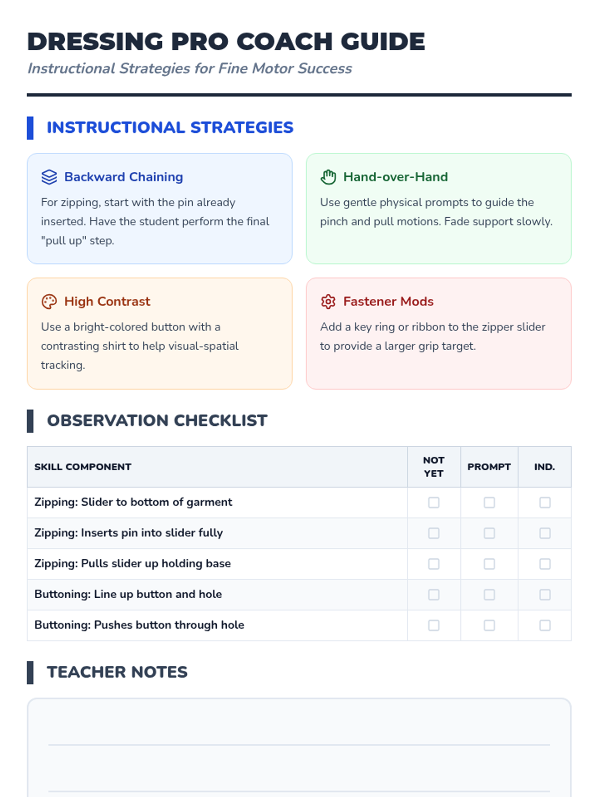 A teacher-facing resource providing instructional strategies (like backward chaining) and an observation checklist for monitoring student progress in zipping and buttoning.