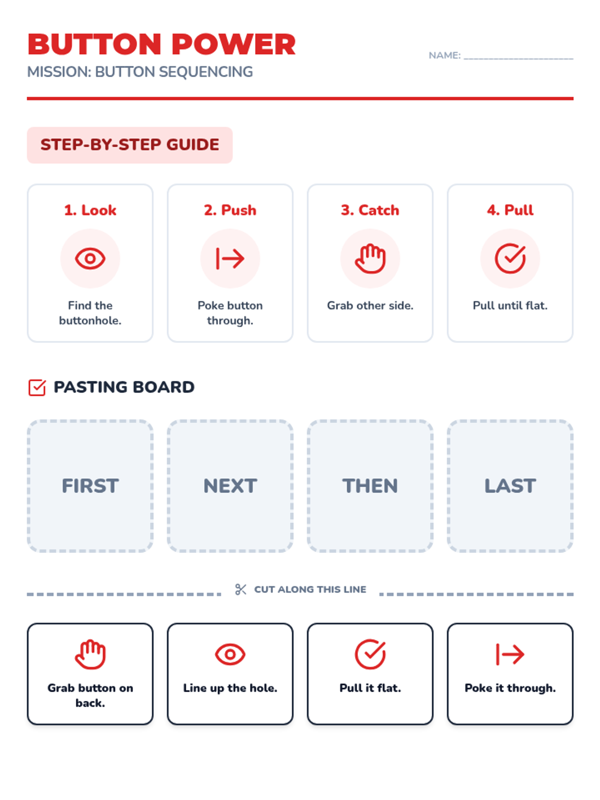 A student worksheet featuring visual step-by-step instructions and a cut-and-paste sequencing activity to reinforce the stages of buttoning.