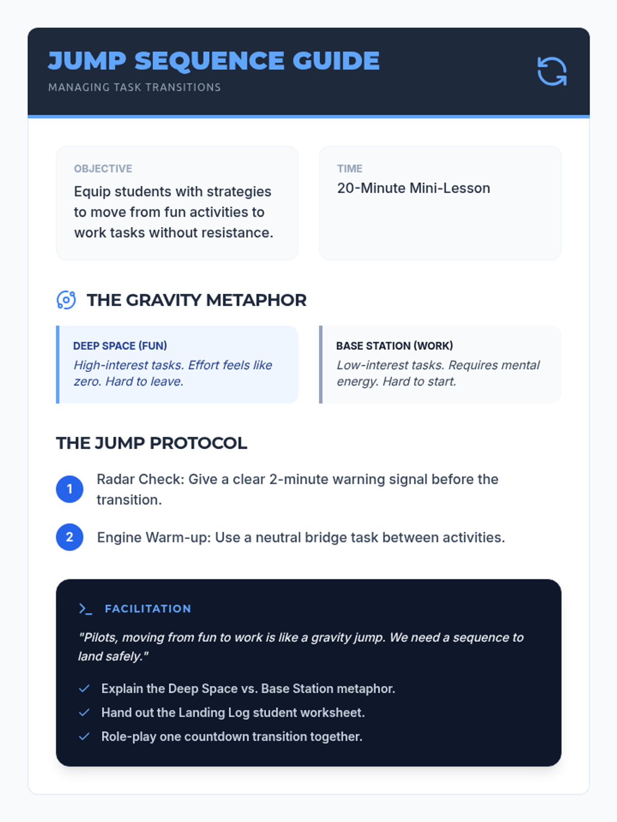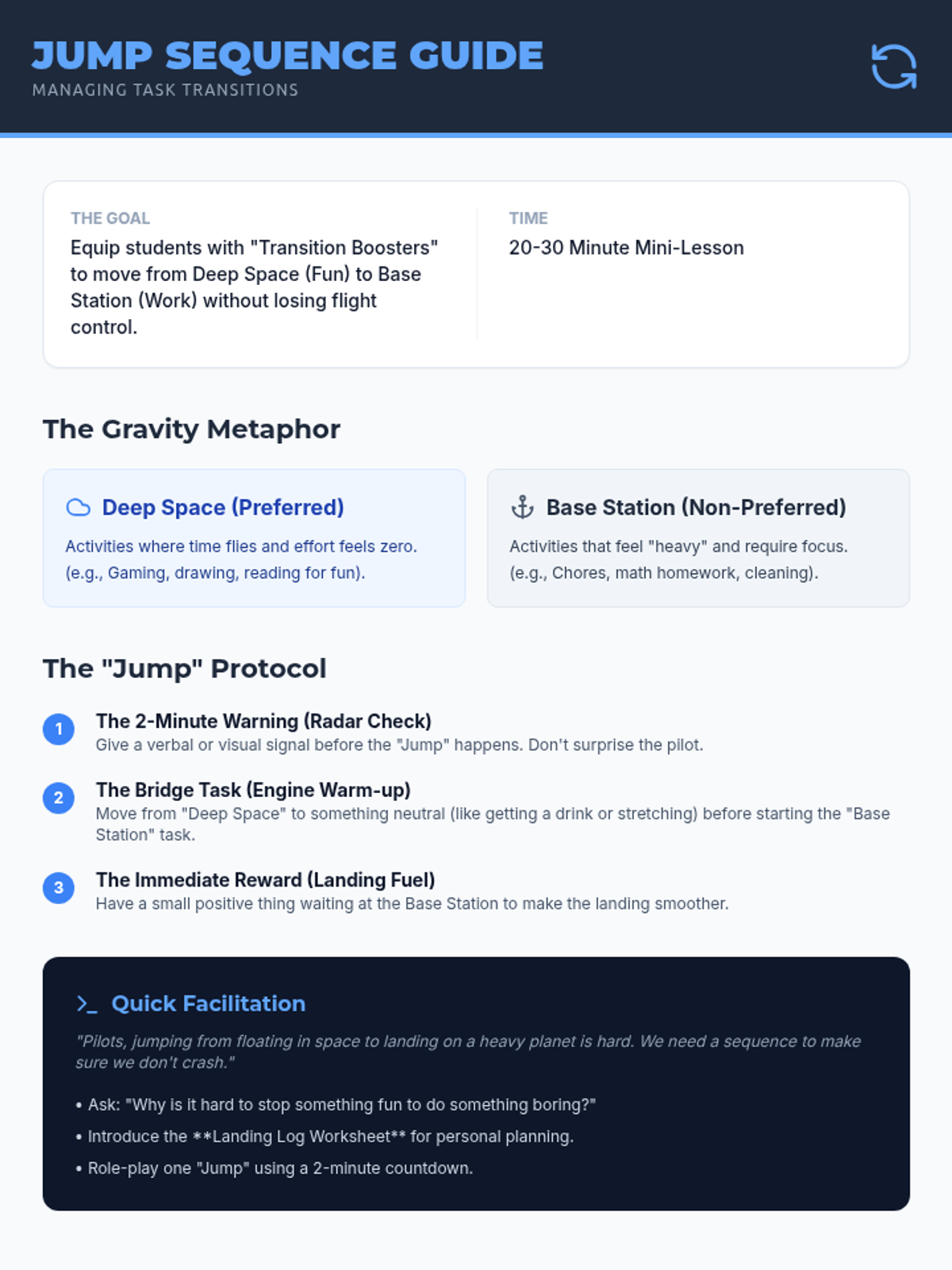 A concise teacher's guide for teaching students how to transition from high-interest (preferred) activities to low-interest (non-preferred) tasks using the "Gravity Jump" metaphor. Includes facilitation notes and specific transition strategies. Now optimized with larger text for print readability. No raw markdown included.