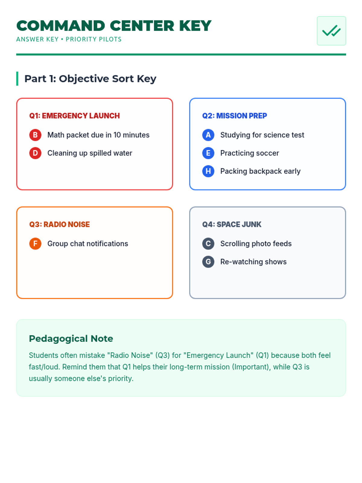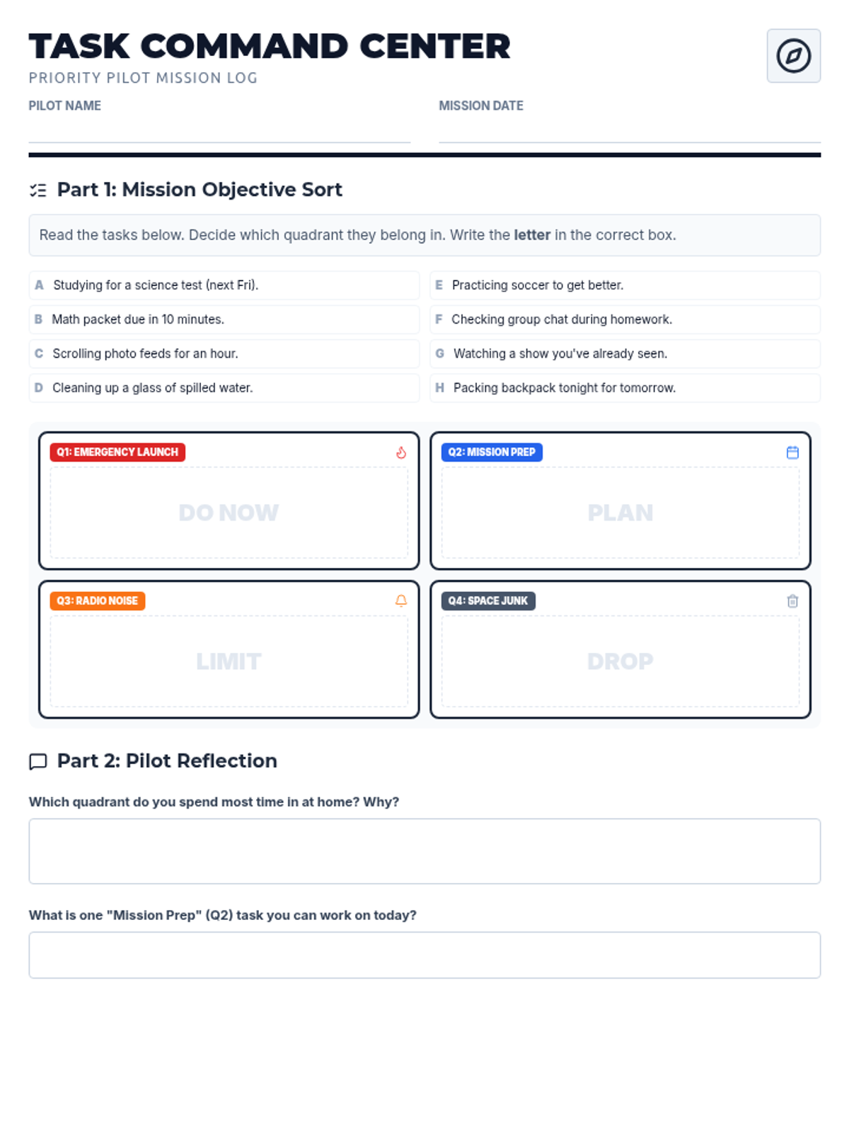 A student-facing worksheet for sorting everyday tasks into the Eisenhower Matrix. Includes a space-themed "Mission Matrix" for classification and a reflection section for self-assessment. Now optimized for a single-page layout with thematic quadrant titles.