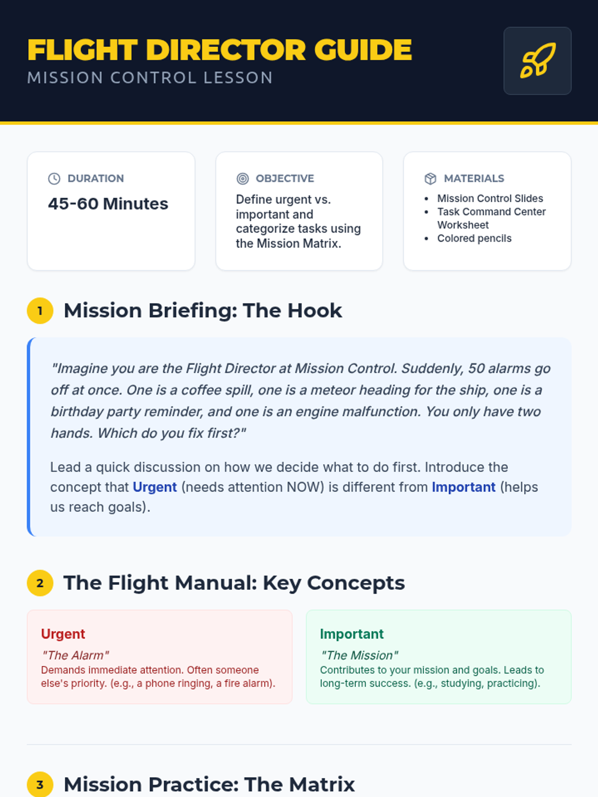 A teacher-facing lesson guide for "Priority Pilots," introducing the Eisenhower Matrix (Mission Matrix) to 5th graders with a space theme. Includes hooks, key definitions, and discussion prompts.