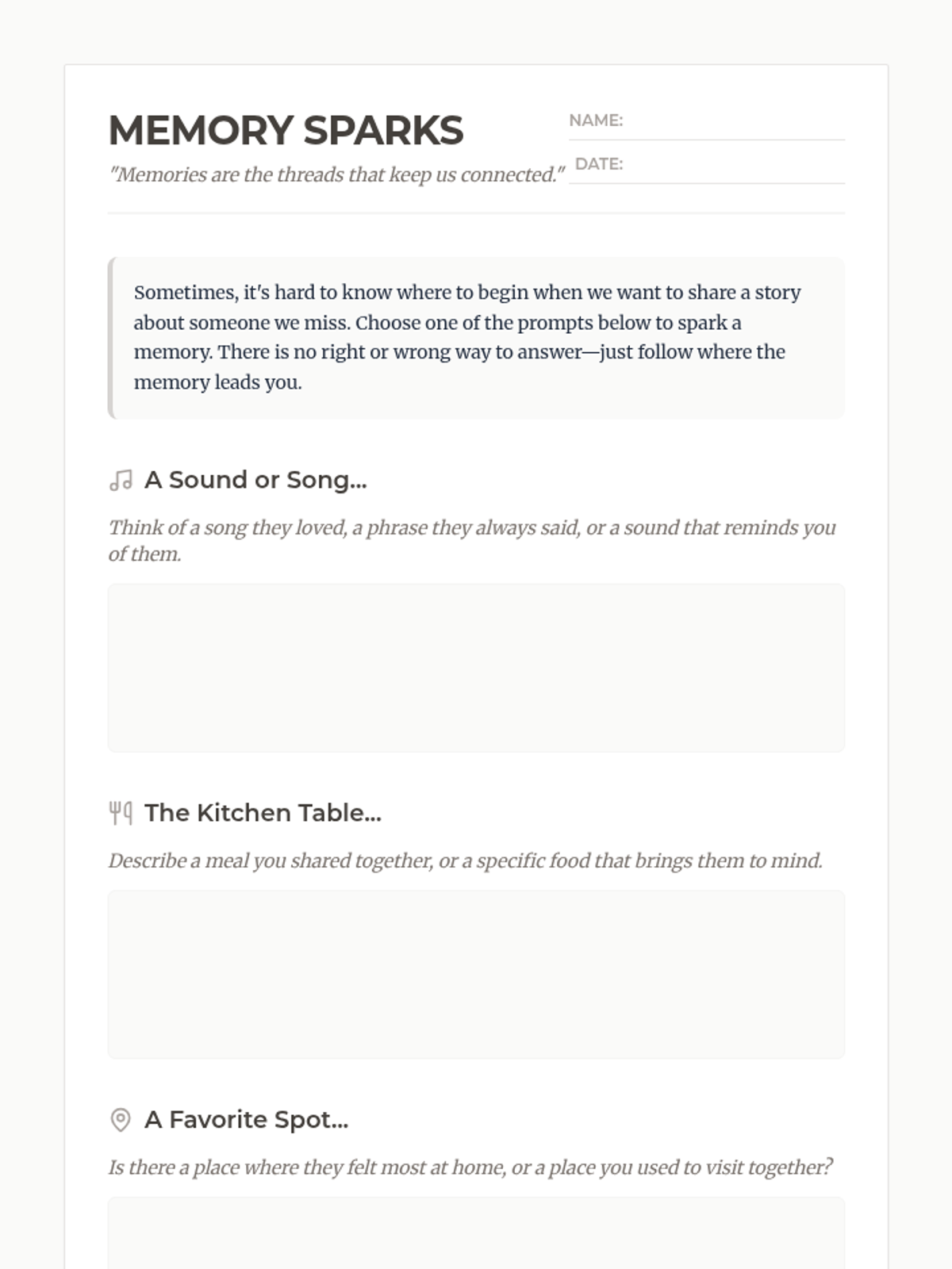 A two-page memory-sharing worksheet featuring reflective story starters and a dedicated space for drawing, designed for use in grief support groups.