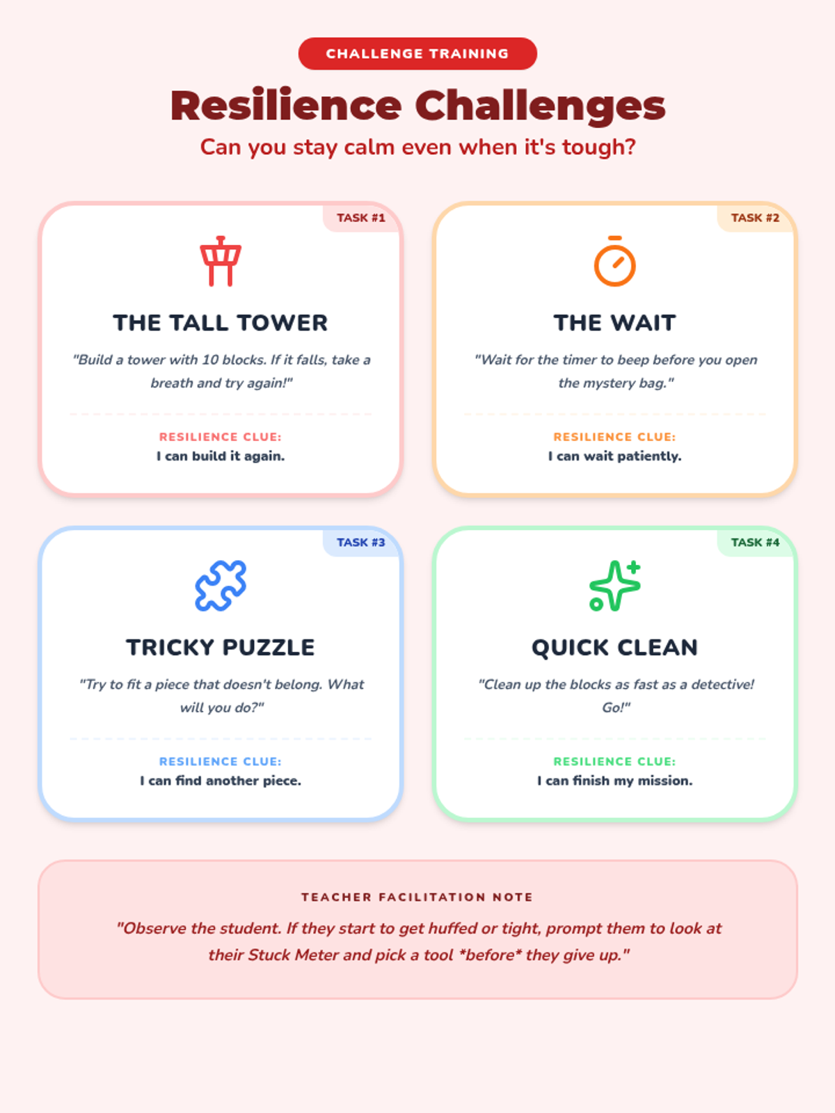 A set of 4 mini-challenge cards designed to provide controlled opportunities for students to practice stress tolerance and resilience through simple, age-appropriate tasks.