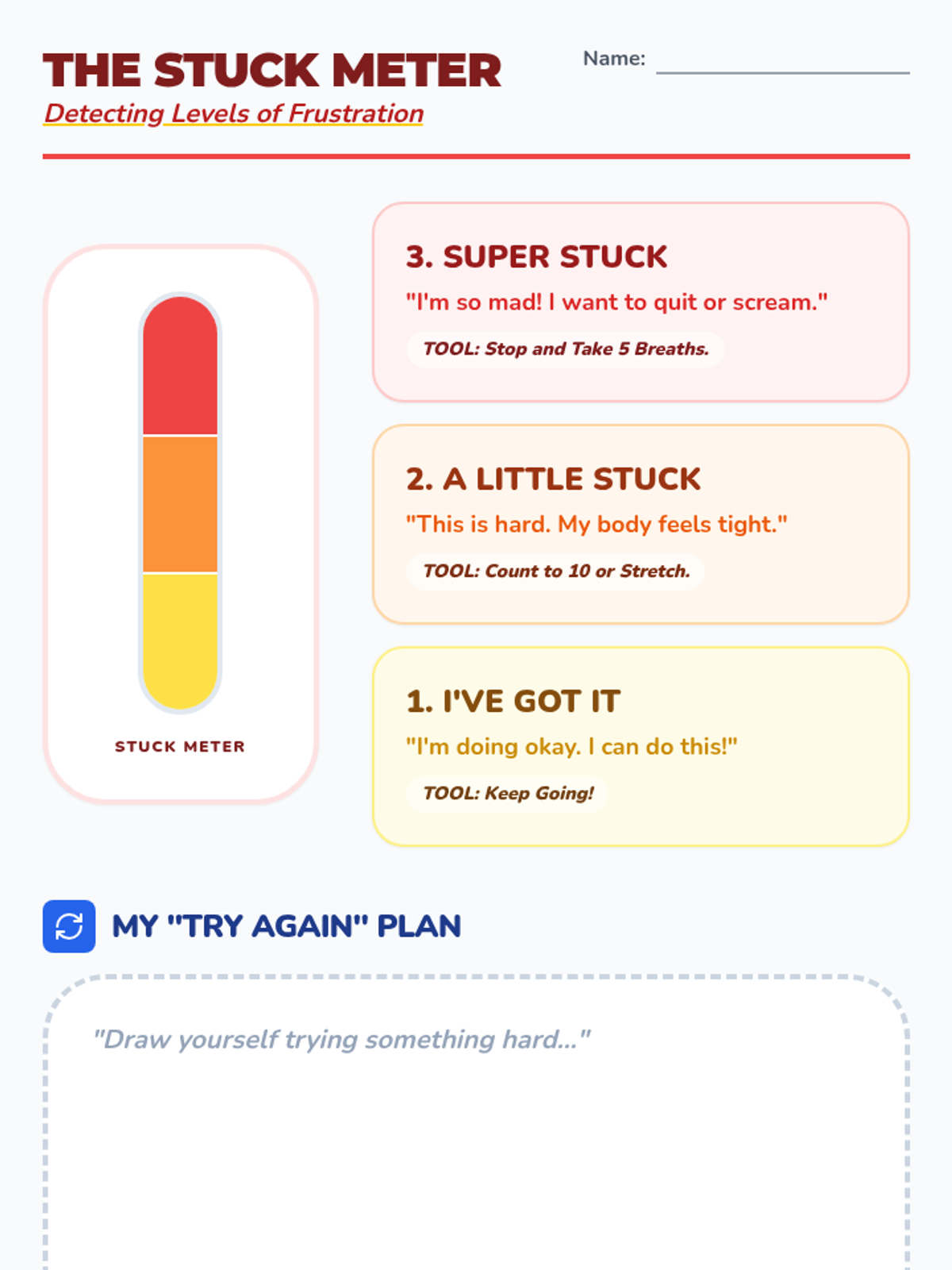A visual worksheet featuring the 'Stuck Meter' to help students identify their level of frustration and select an appropriate self-regulation tool. Includes a drawing area for a 'Try Again' plan.