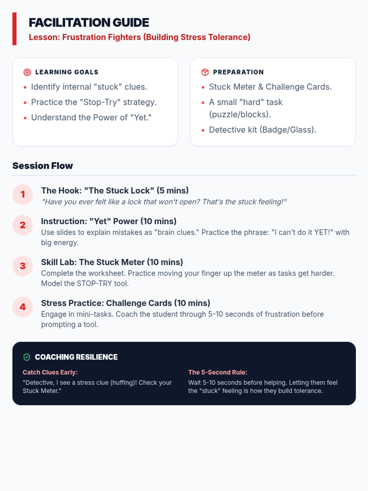 A teacher facilitation guide for the 'Frustration Fighters' lesson, focusing on coaching strategies for resilience and identifying stress cues in young learners.