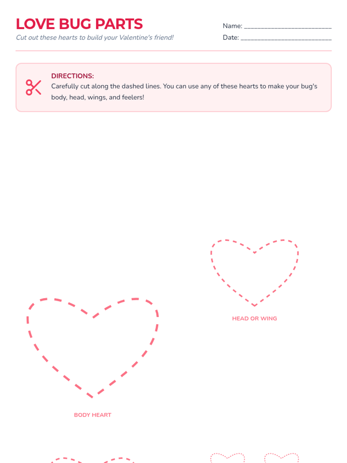 A heart-shaped template worksheet featuring various sizes of hearts for students to cut out and assemble into their 'Love Bug' creations.
