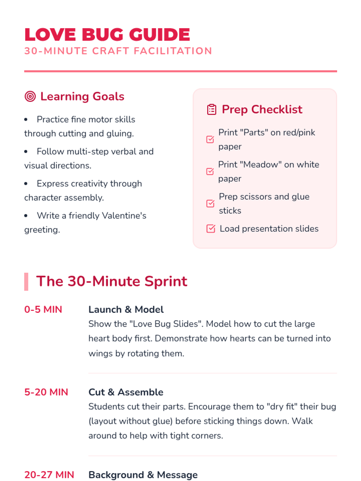 A concise teacher guide for the Love Bug craft, including learning objectives, a 30-minute pacing guide, differentiation tips, and discussion prompts.