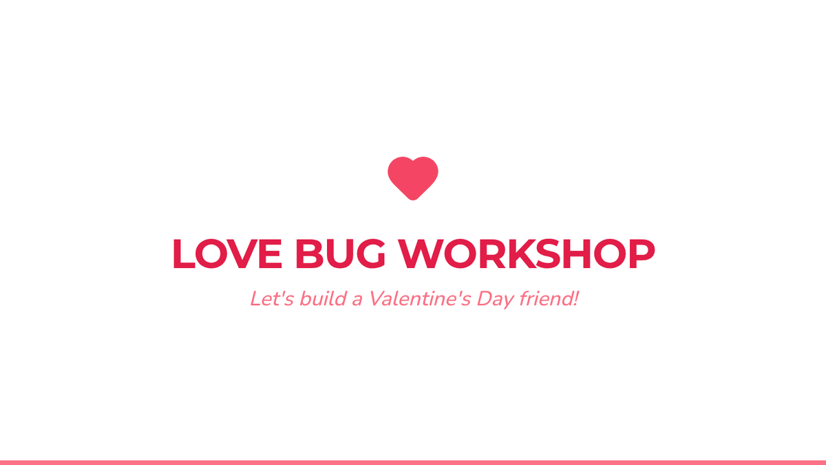 A slide deck introducing the 'Love Bug' craft, featuring step-by-step instructions for cutting, designing, and assembling heart-shaped creatures.