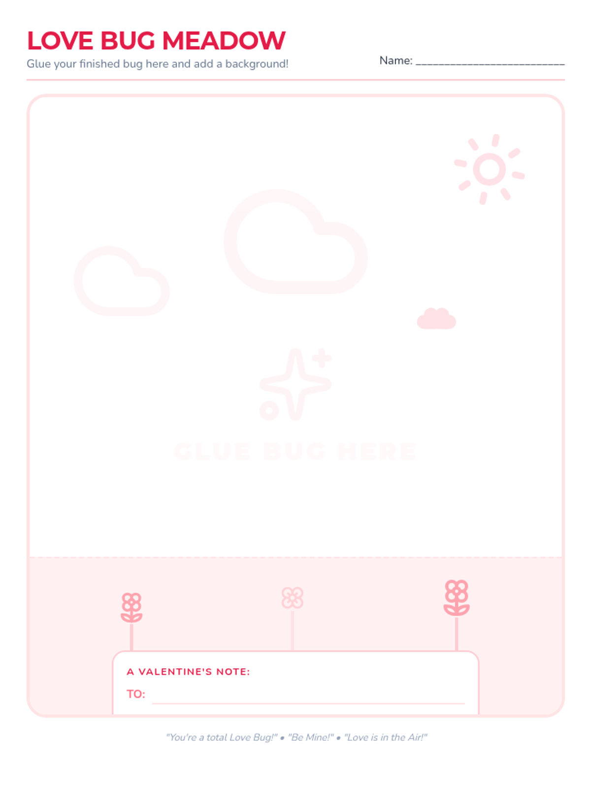 A background sheet titled 'Love Bug Meadow' where students glue their heart-shaped creatures and write a personalized Valentine's Day message.