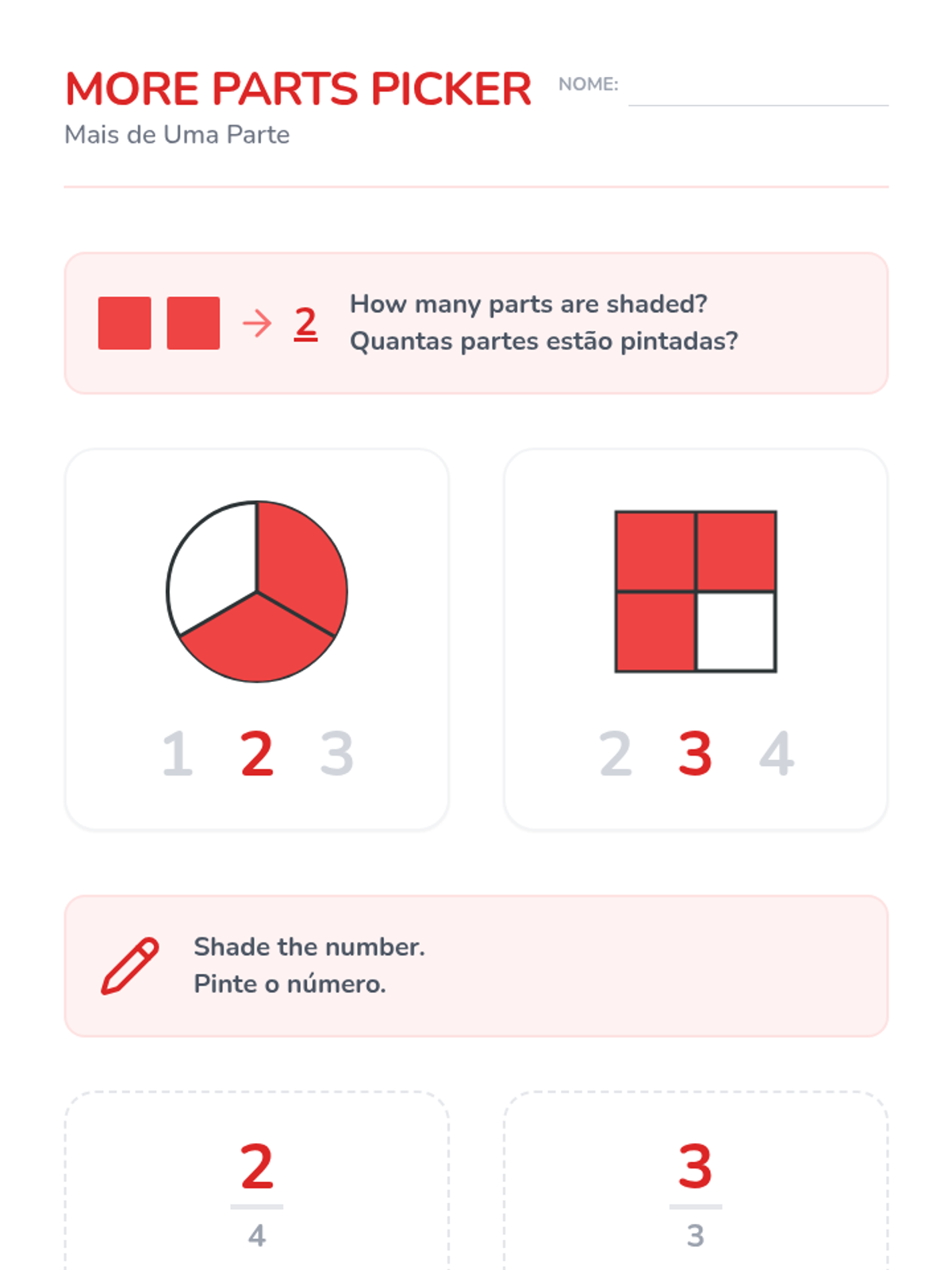 A visual worksheet for non-unit fractions where students count shaded parts and shade a specific number of parts in various shapes.