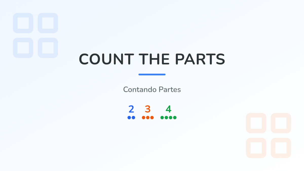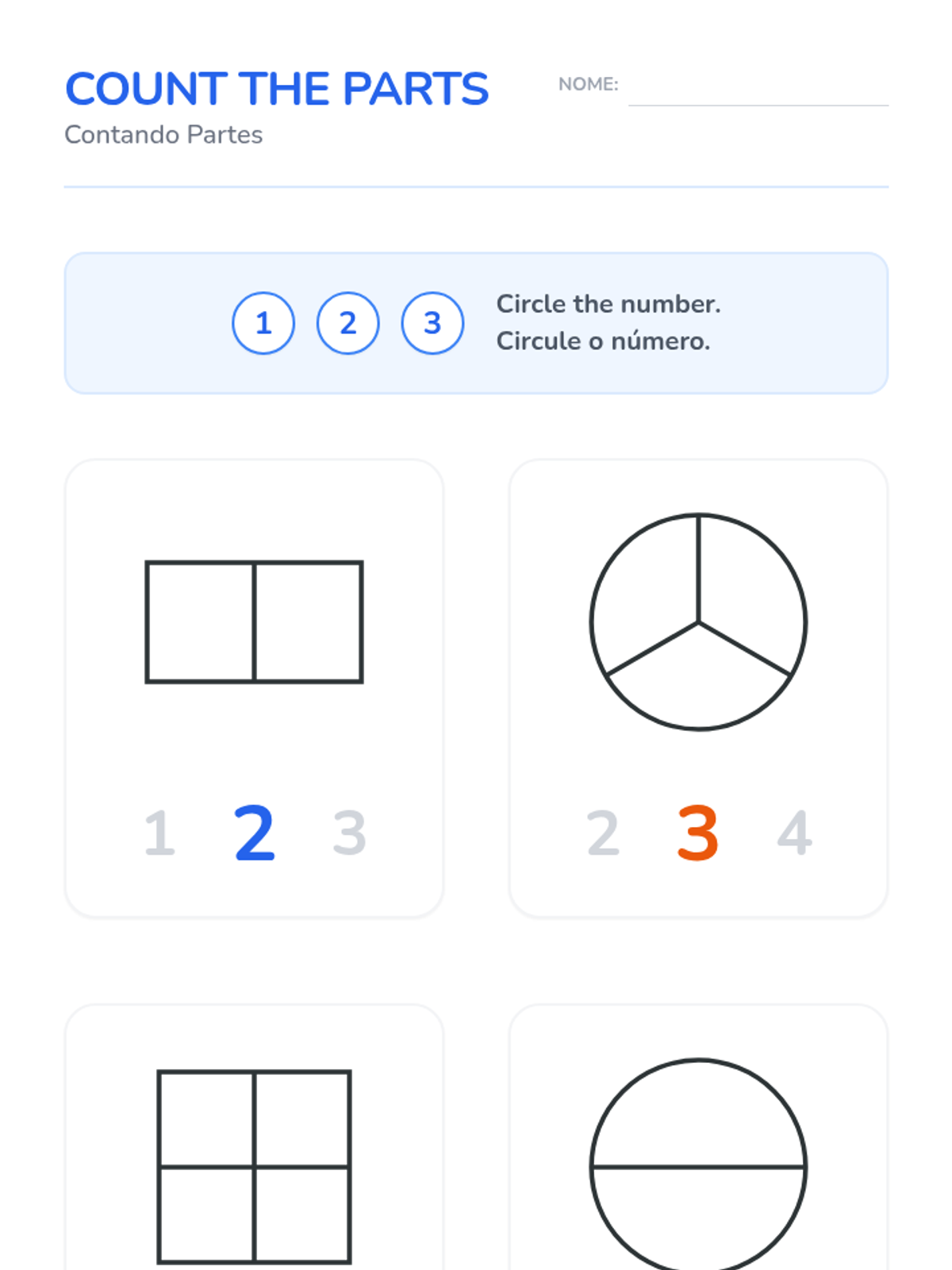 A visual counting worksheet where students identify the number of equal parts (2, 3, or 4) by circling the corresponding number.