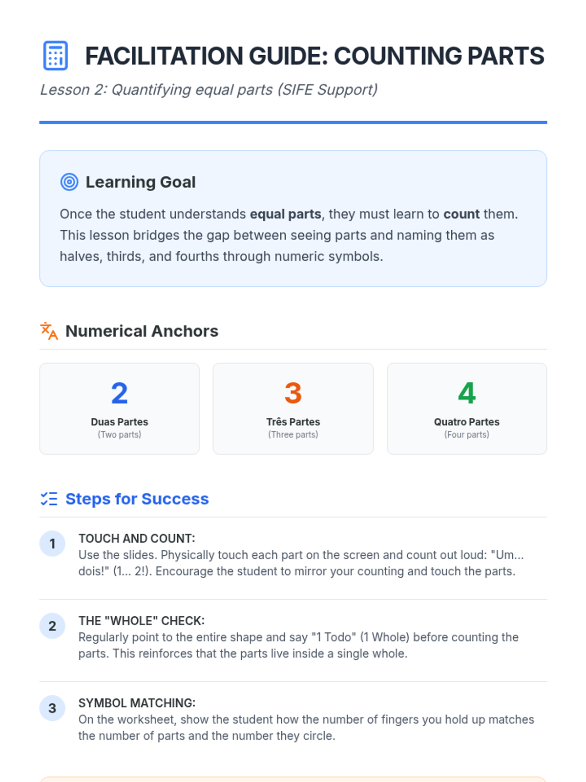 A teacher facilitation guide for Lesson 2, focusing on strategies for counting equal parts and common misconceptions for SIFE students.