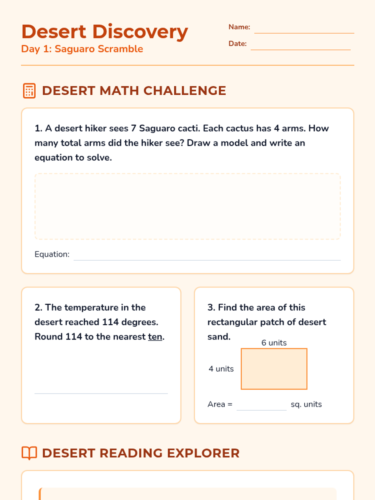 A 3-day spiral review worksheet for 3rd-grade Arizona math and reading standards, featuring multiplication, division, area, fractions, rounding, main idea, and central message with a desert theme. Corrected typo in Day 3 math.