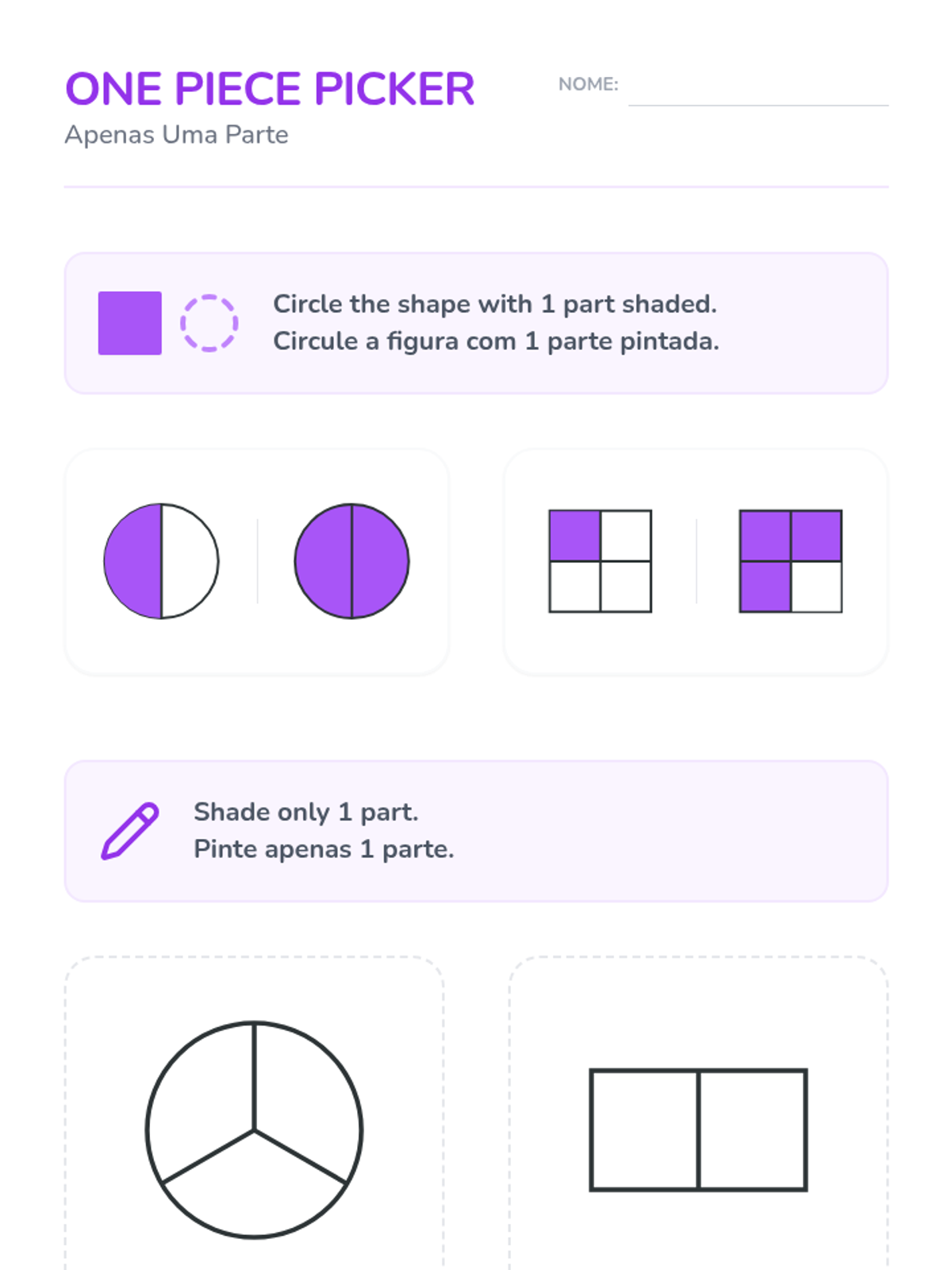 A visual worksheet where students identify and create unit fractions by circling shapes with one shaded part and shading exactly one part of various equal-part shapes.