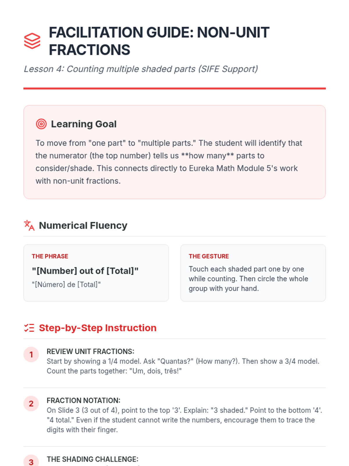 A teacher facilitation guide for Lesson 4, focusing on the transition to non-unit fractions and counting multiple shaded parts for SIFE students.