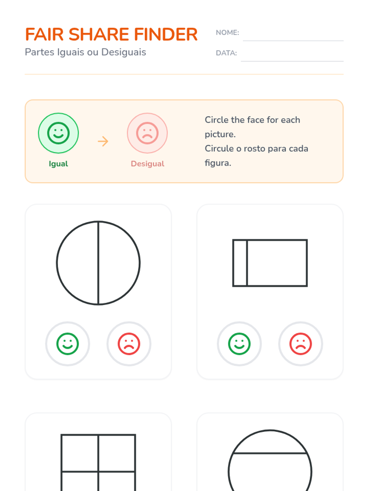 A highly visual assessment worksheet where students identify equal vs. unequal parts by circling corresponding facial icons, featuring minimal text in both English and Portuguese.