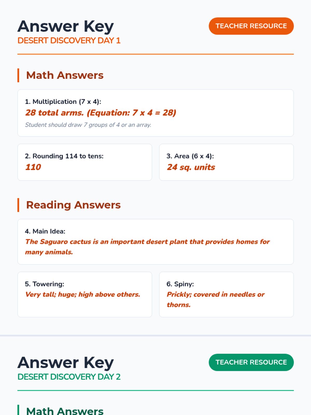 Teacher answer key for the 3-day Desert Discovery spiral review, providing detailed solutions for math problems and suggested reading responses.
