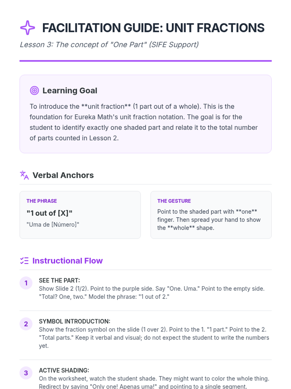 A teacher facilitation guide for Lesson 3, focusing on introducing the unit fraction concept and verbal phrasing for non-literate SIFE students.