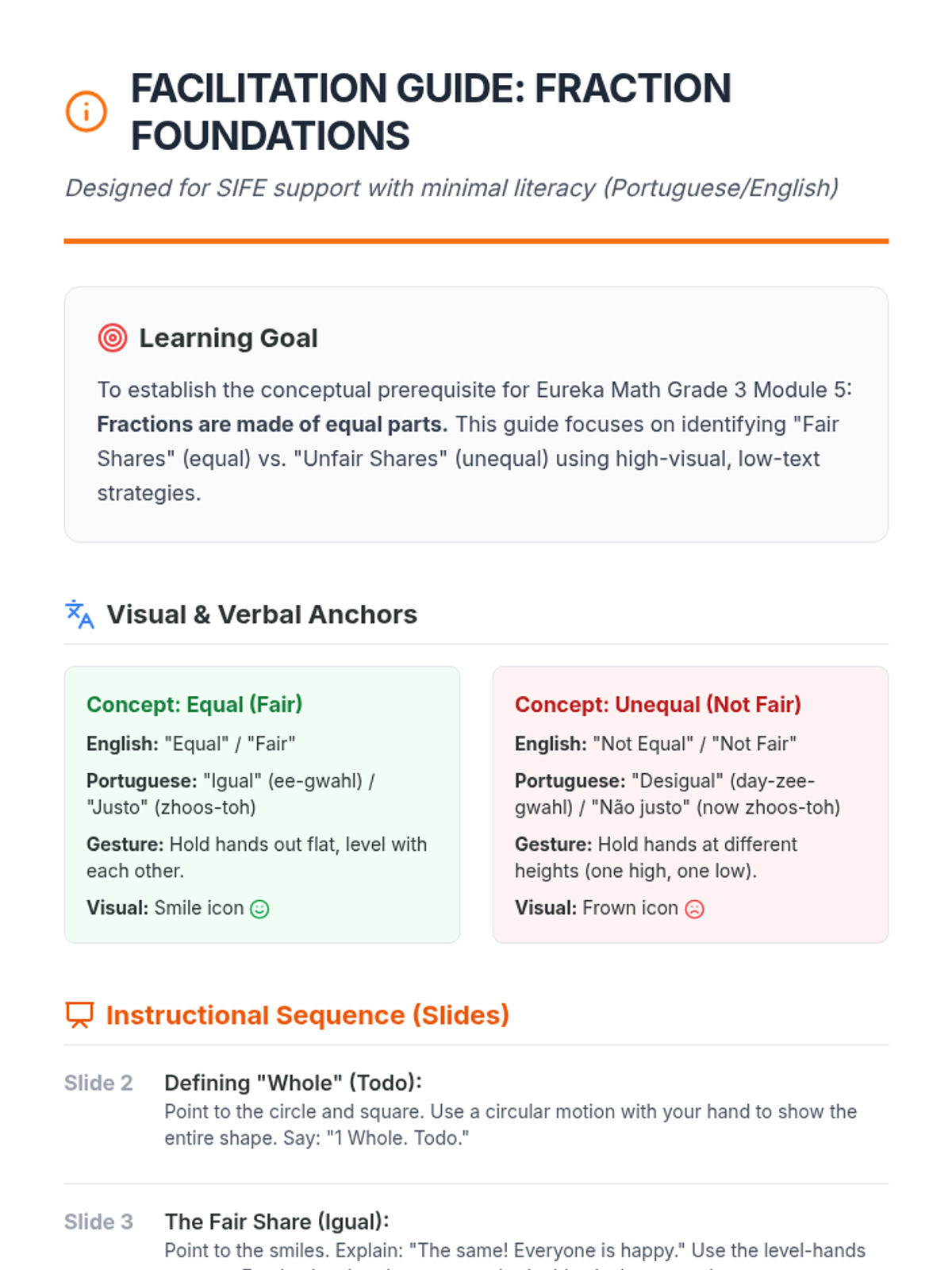 A teacher facilitation guide providing instructional strategies, key Portuguese vocabulary, and assessment tips for supporting a SIFE student with foundational fraction concepts.