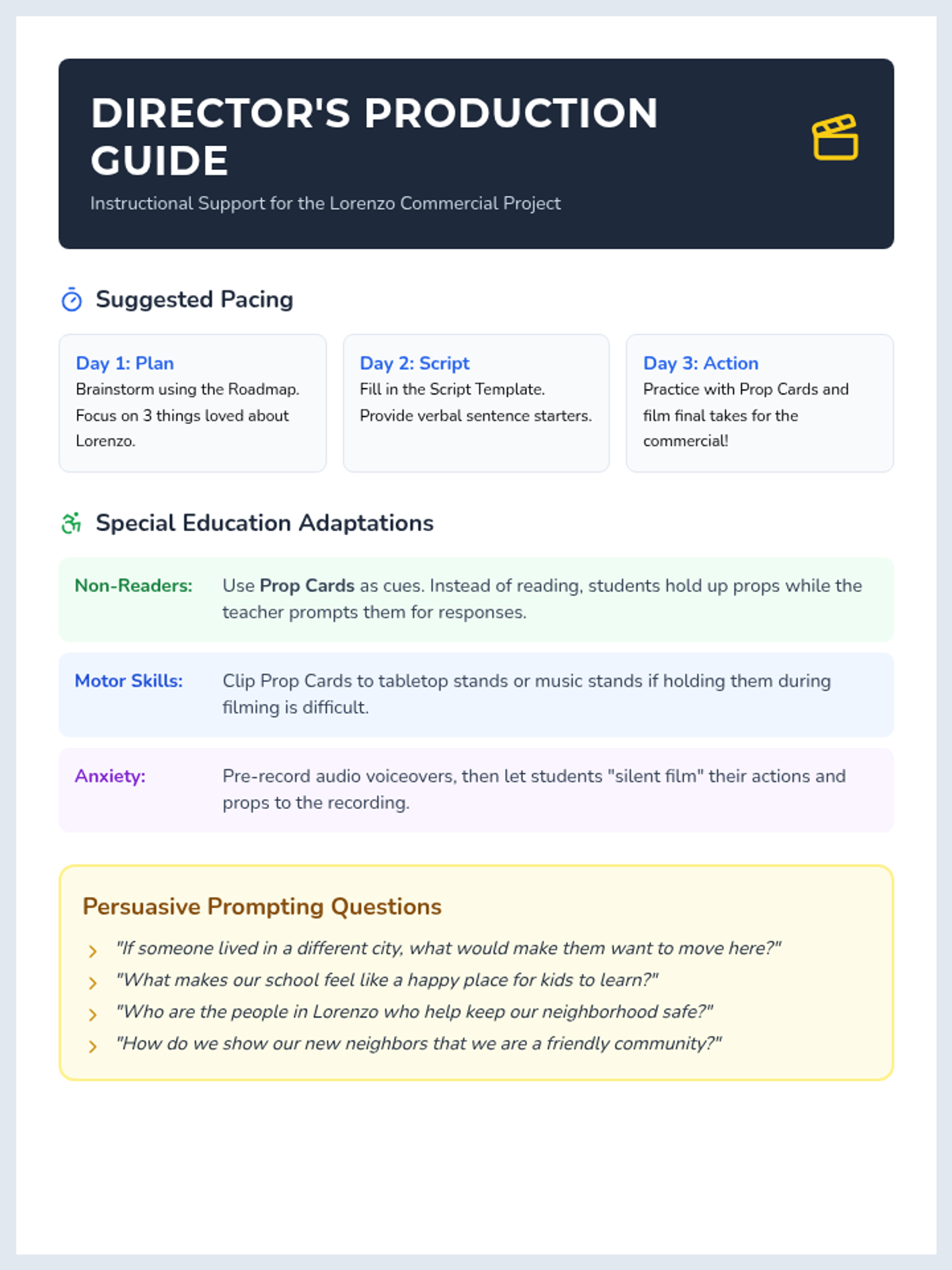 A comprehensive teacher guide providing pacing suggestions, differentiation strategies for special needs students, and discussion prompts to facilitate the commercial creation project. Consolidated to a single page.
