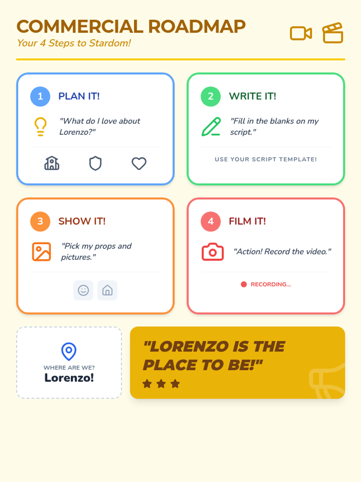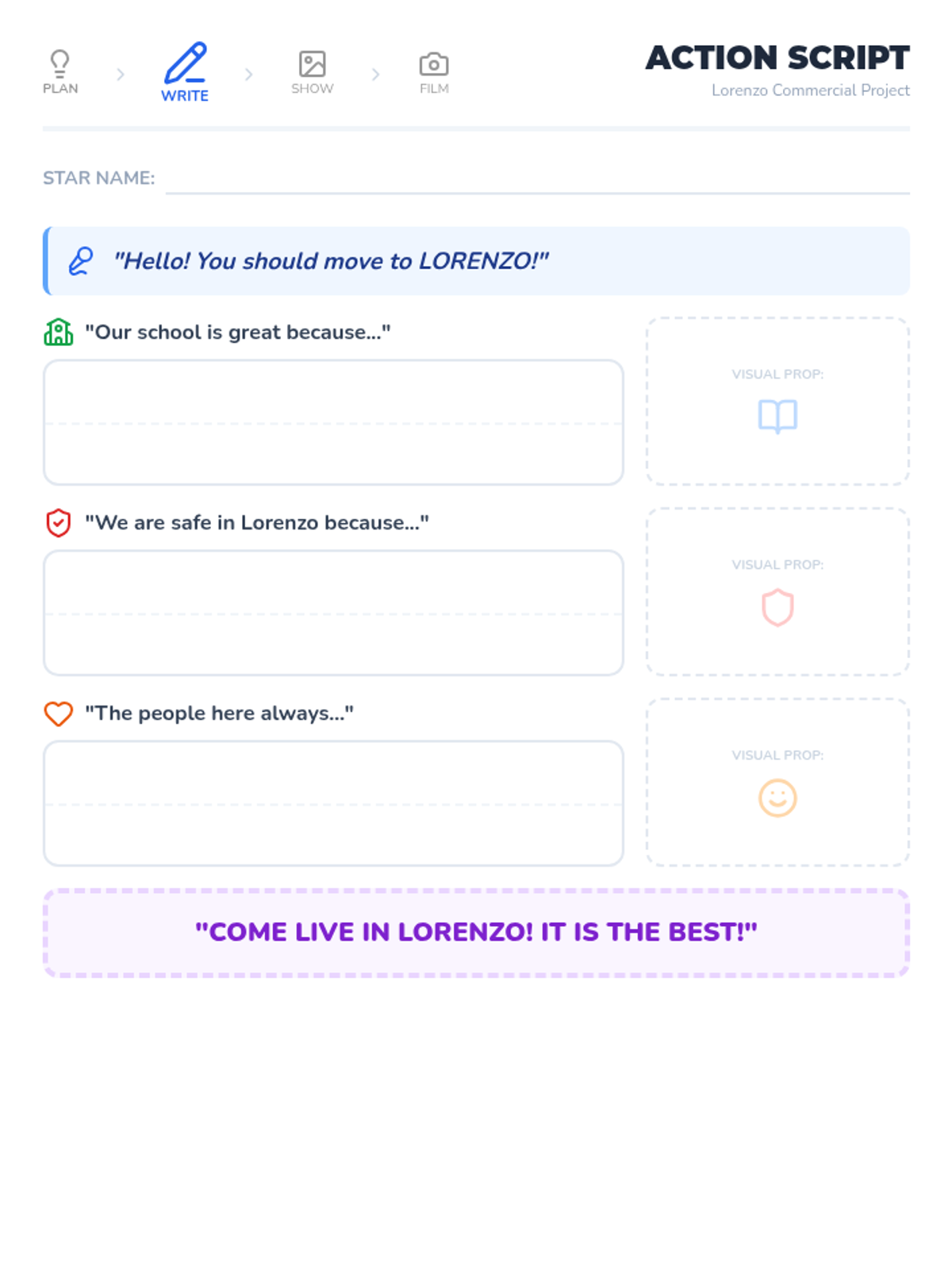 A simplified, fill-in-the-blank script template for a persuasive commercial about Lorenzo. This version fits on one page and includes visual prop cues and the commercial sequence steps.