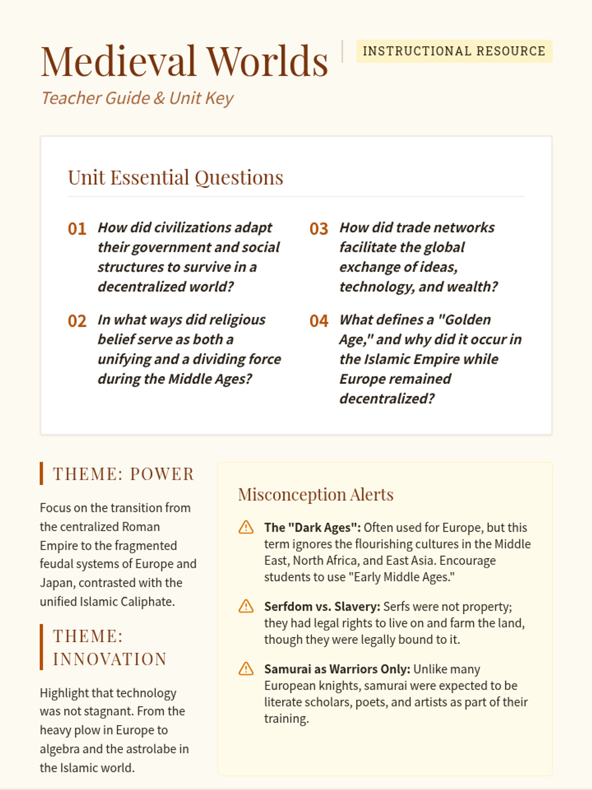 A comprehensive teacher guide for the Middle Ages unit, featuring unit-wide essential questions, key themes, common misconceptions, and detailed answer keys for all student worksheets.