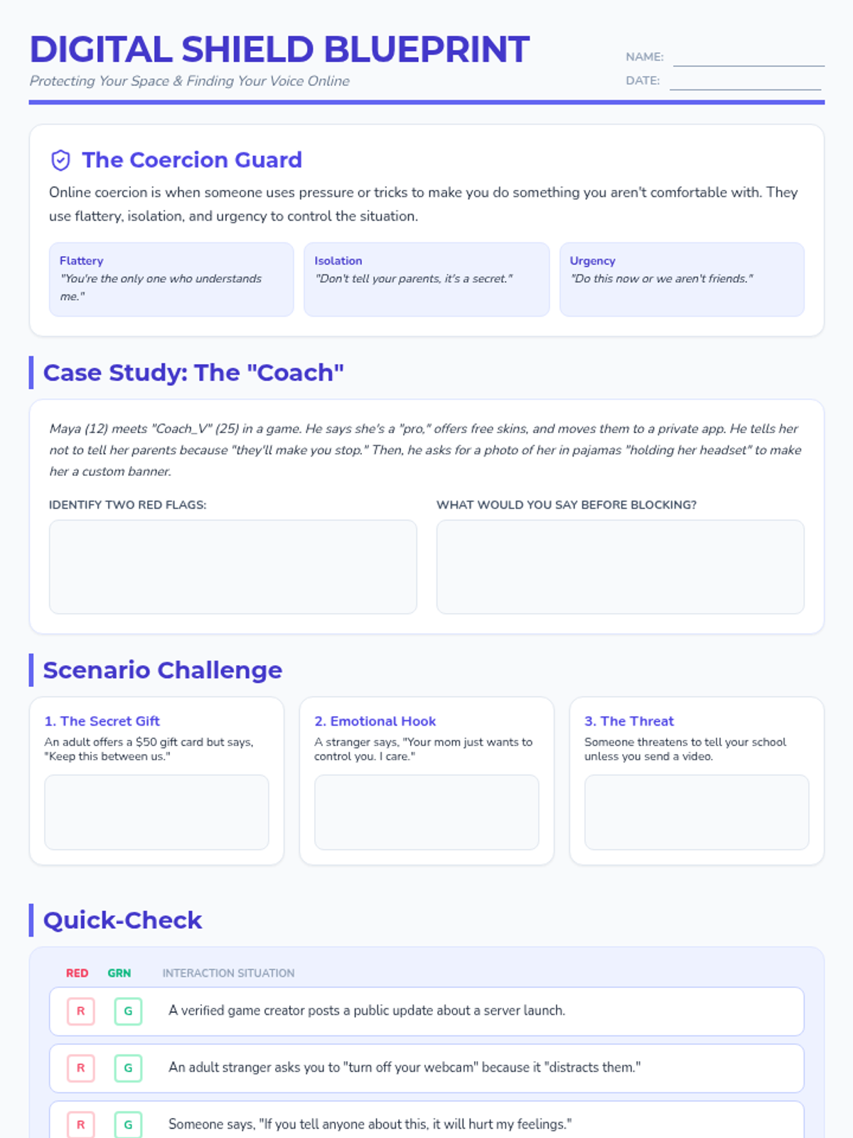 A comprehensive internet safety worksheet for 6th-grade students focusing on online coercion and personal boundaries. It includes a detailed case study, short scenarios, quick-check examples, and a personal safety plan template to empower students to recognize and respond to predatory adult behavior online. Revised for better page breaks and clarity.