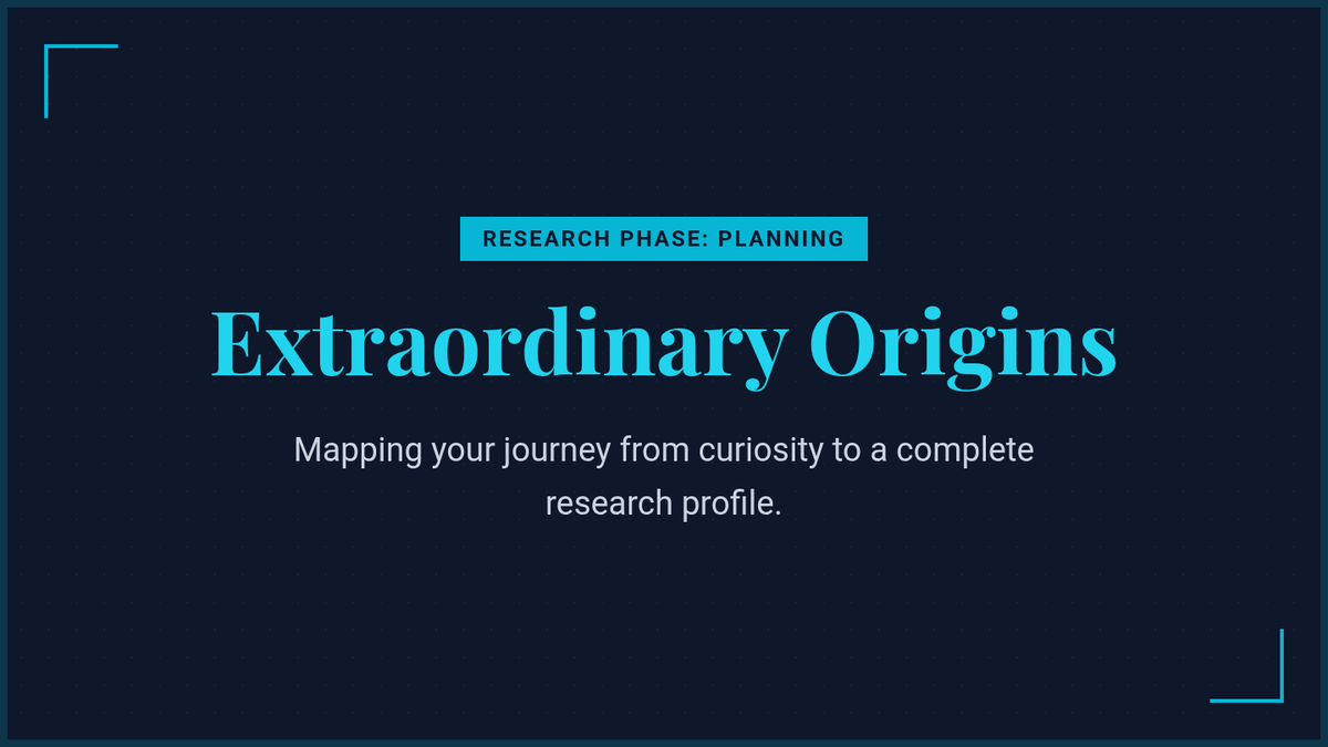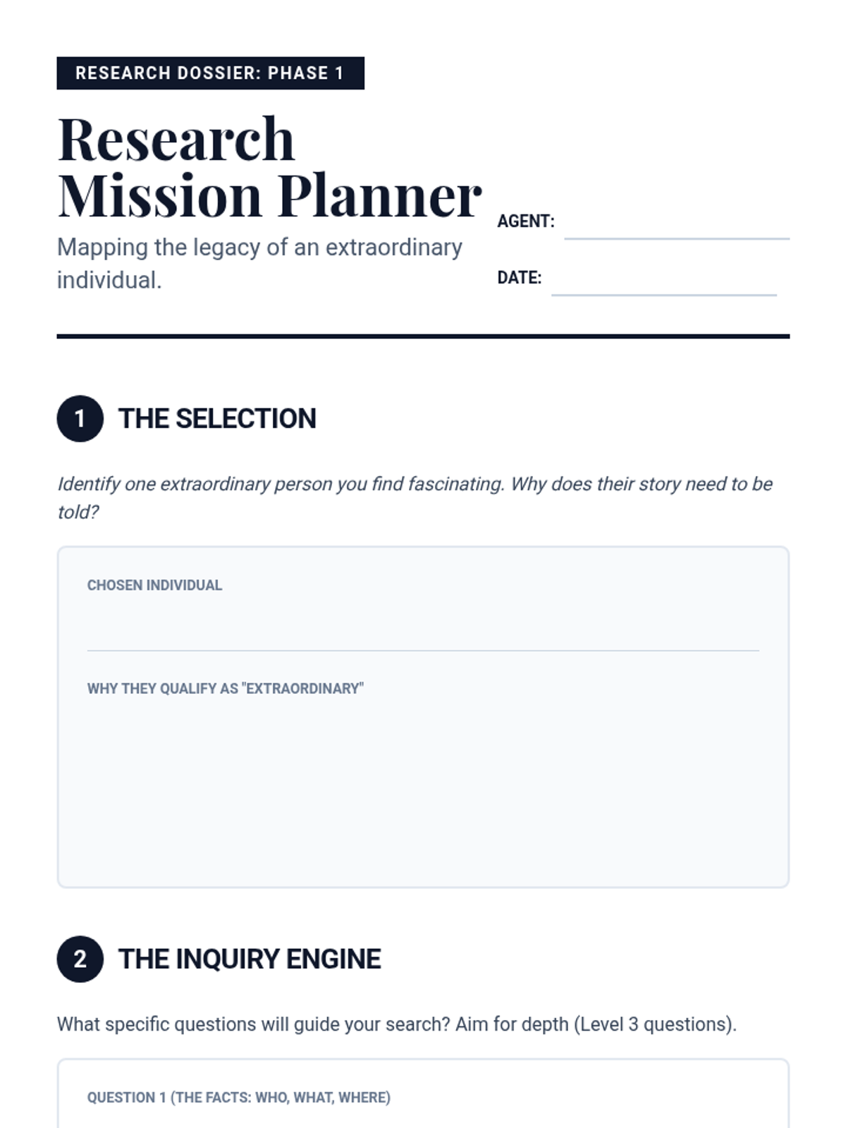 A 7-slide presentation designed to guide students through the planning phase of researching an extraordinary person. It covers selection criteria, inquiry question development, source evaluation, note-taking strategies, and essay outlining.