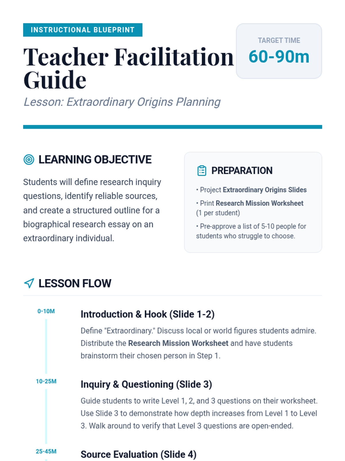 A comprehensive facilitation guide for teachers to lead the Extraordinary Origins planning lesson. It includes learning objectives, a timed lesson flow, common misconceptions, and differentiation strategies.